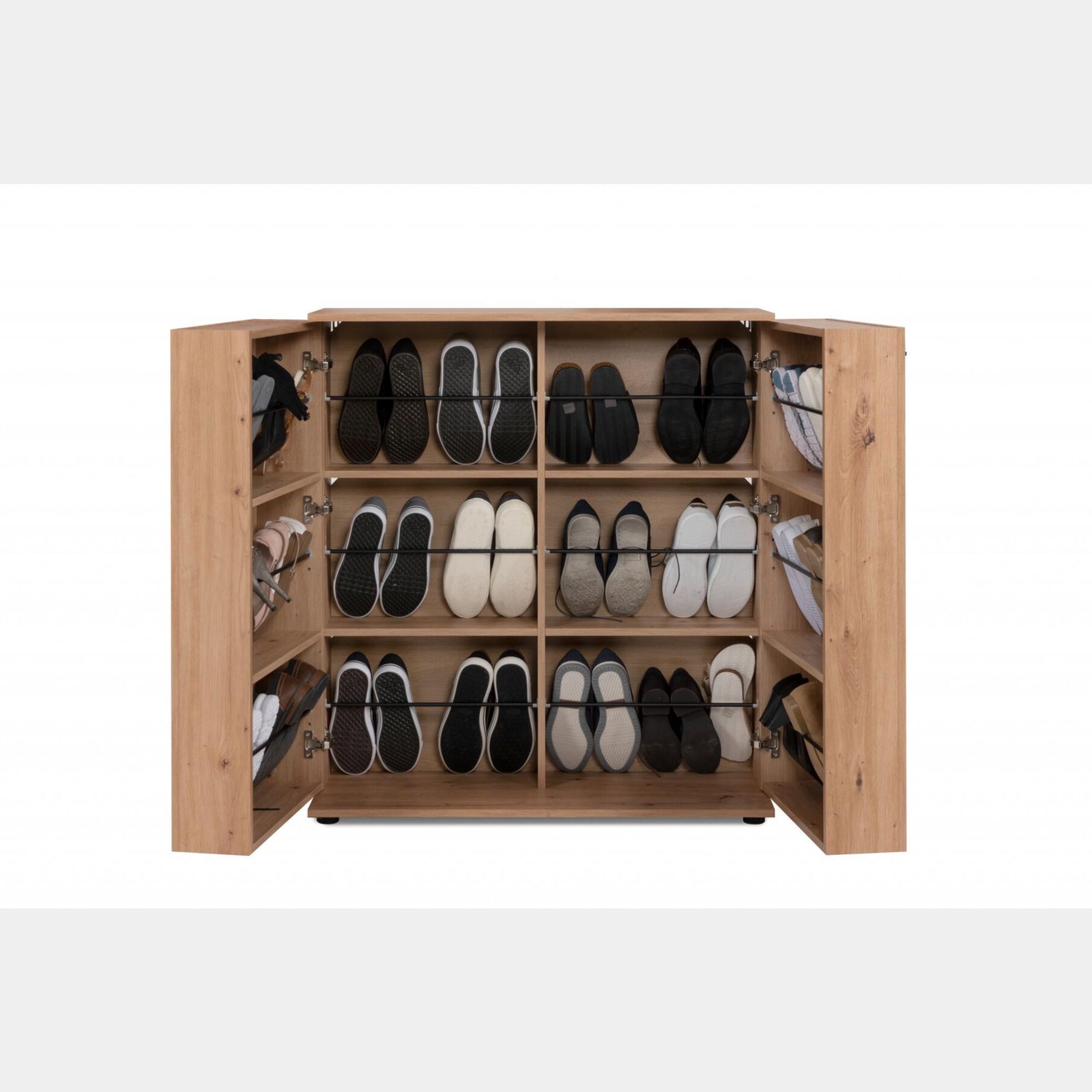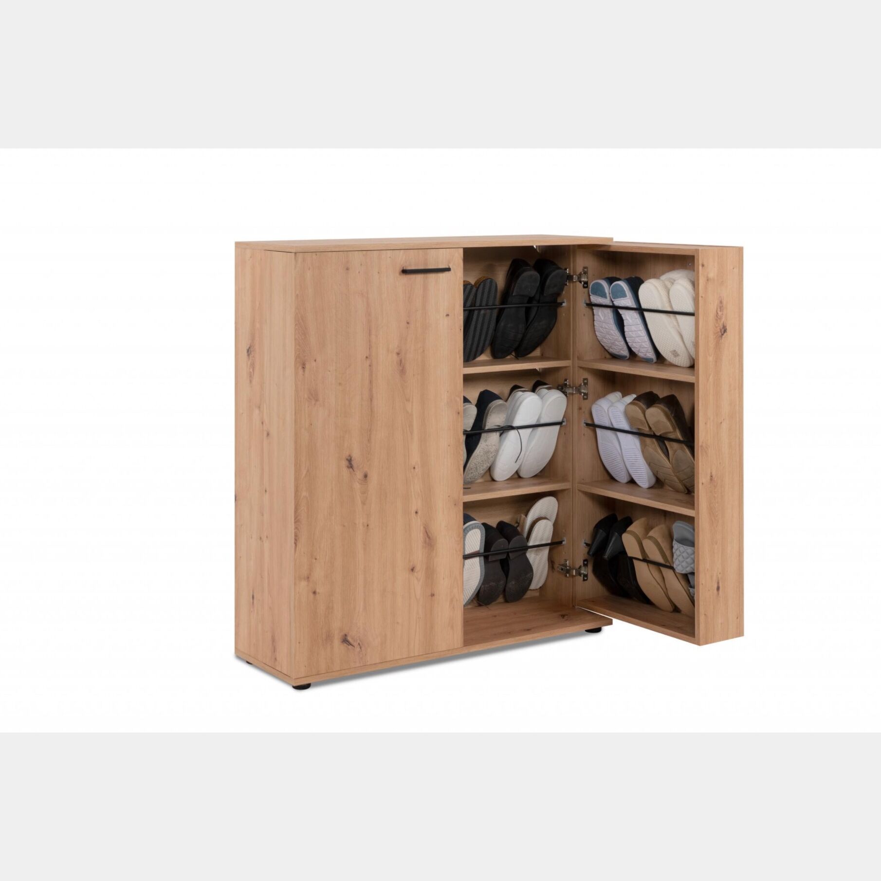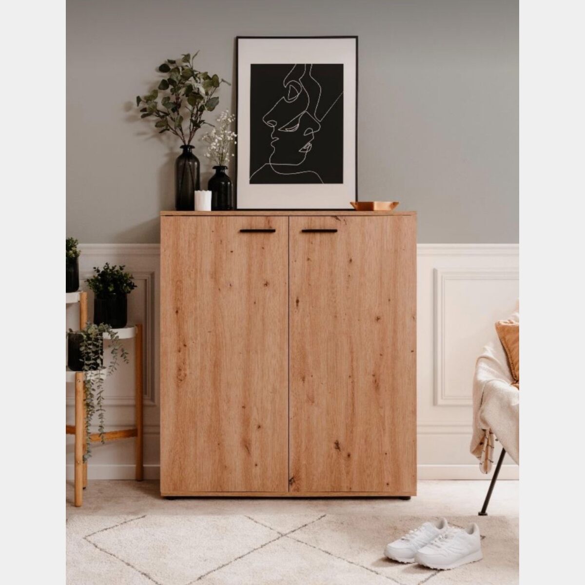 Capiente scarpiera a 2 ante finitura Rovere Oak, dallo stile nordico contiene fino a 24 paia di scarpe.