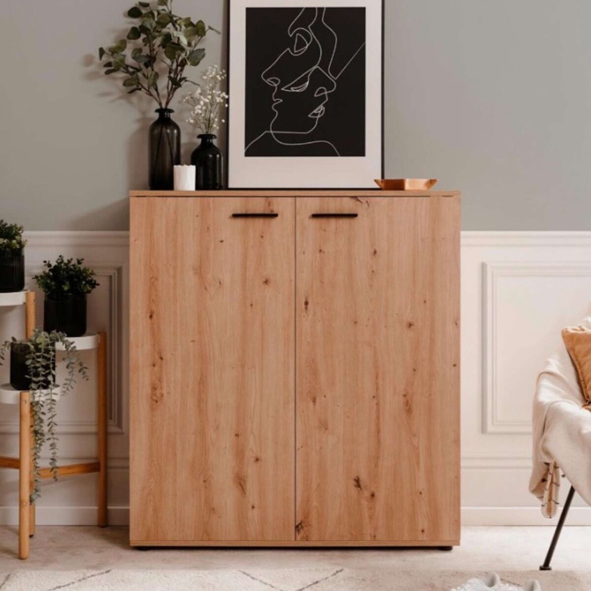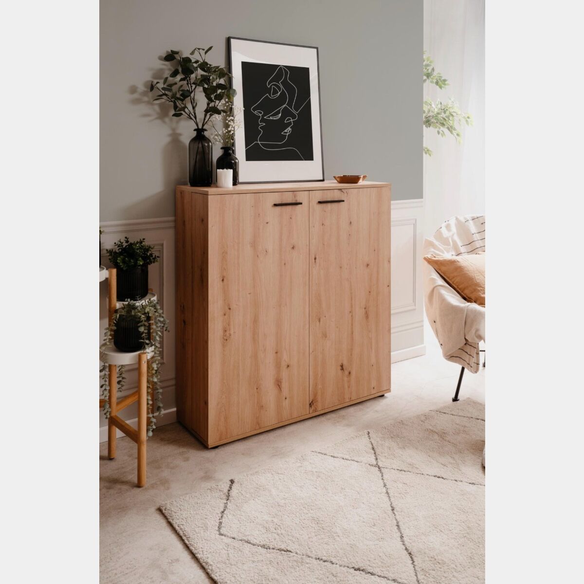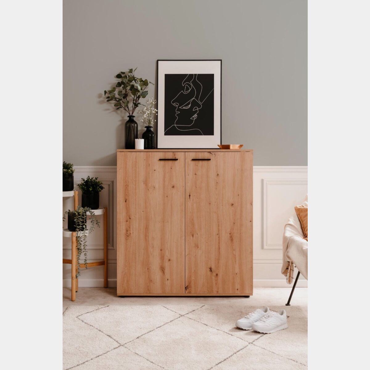 Capiente scarpiera a 2 ante finitura Rovere Oak, dallo stile nordico contiene fino a 24 paia di scarpe.