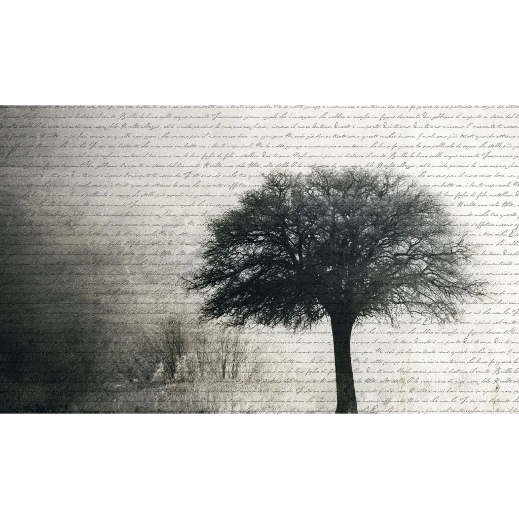 L'effetto complessivo è quello di un'opera d'arte a parete che evoca un senso di poesia, riflessione e connessione tra la natura e la parola scritta. La palette di colori monocromatica in diverse tonalità di grigio conferisce eleganza e un'atmosfera sofisticata e contemplativa.