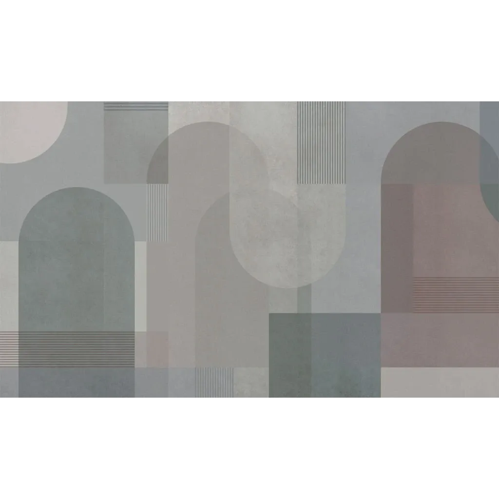 Il motivo è composto da una sovrapposizione di forme geometriche semplici e stilizzate, tra cui archi, cerchi parziali, rettangoli e quadrati. Le forme non sono delineate con contorni netti, ma spesso presentano bordi sfumati o un effetto acquerellato, conferendo un tocco artistico e morbido al design.