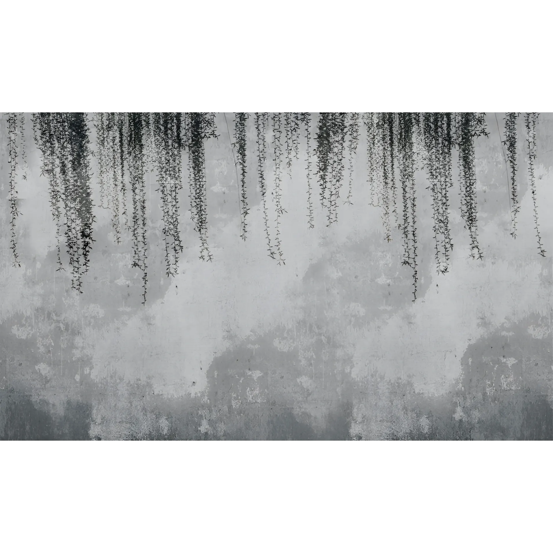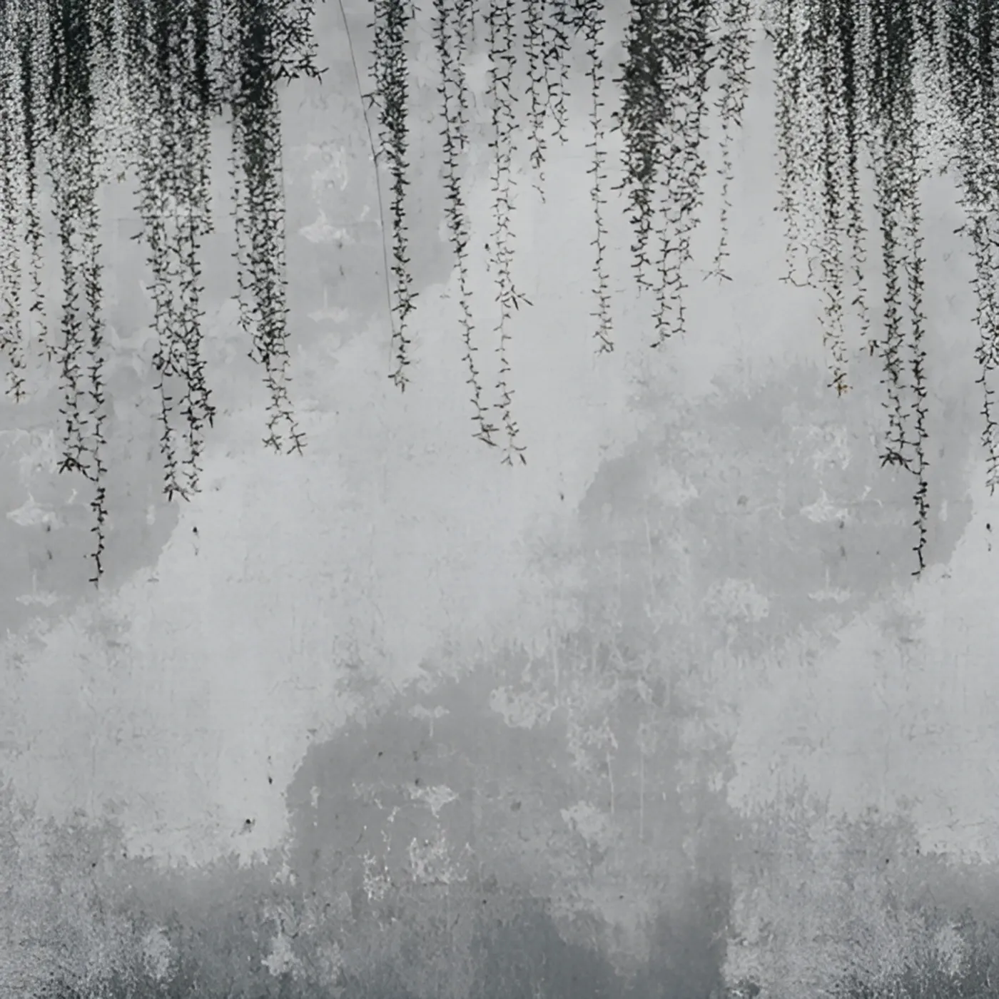 L'effetto complessivo è quello di un paesaggio stilizzato e astratto, con un contrasto tra l'elemento lineare e scuro dei rami pendenti e la superficie più eterea e sfumata dello sfondo. La palette di colori monocromatica in diverse tonalità di grigio conferisce eleganza e modernità, pur mantenendo un forte legame con la natura. Questa carta da parati è ideale per creare un'atmosfera rilassante e sofisticata in una camera da letto, un soggiorno o uno studio, aggiungendo un tocco artistico e contemplativo all'ambiente.