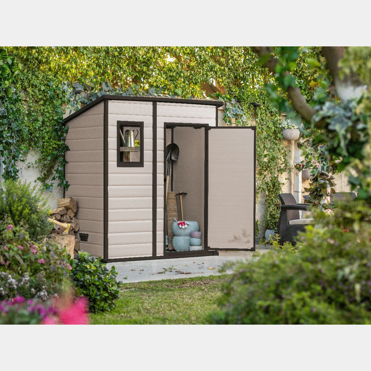 Casetta addossabile con finitura effetto legno graffiato, sufficientemente larga e alta per conservare praticamente qualsiasi cosa, dagli attrezzi da giardino fino agli accessori per la piscina. La casetta disponibile in due diverse colorazioni.