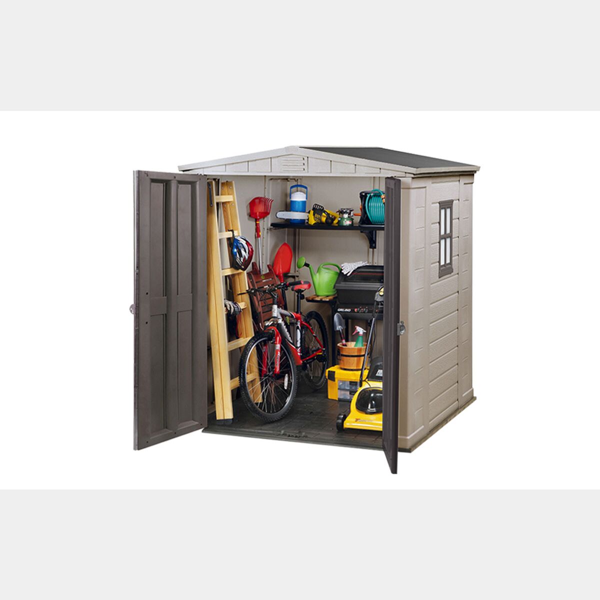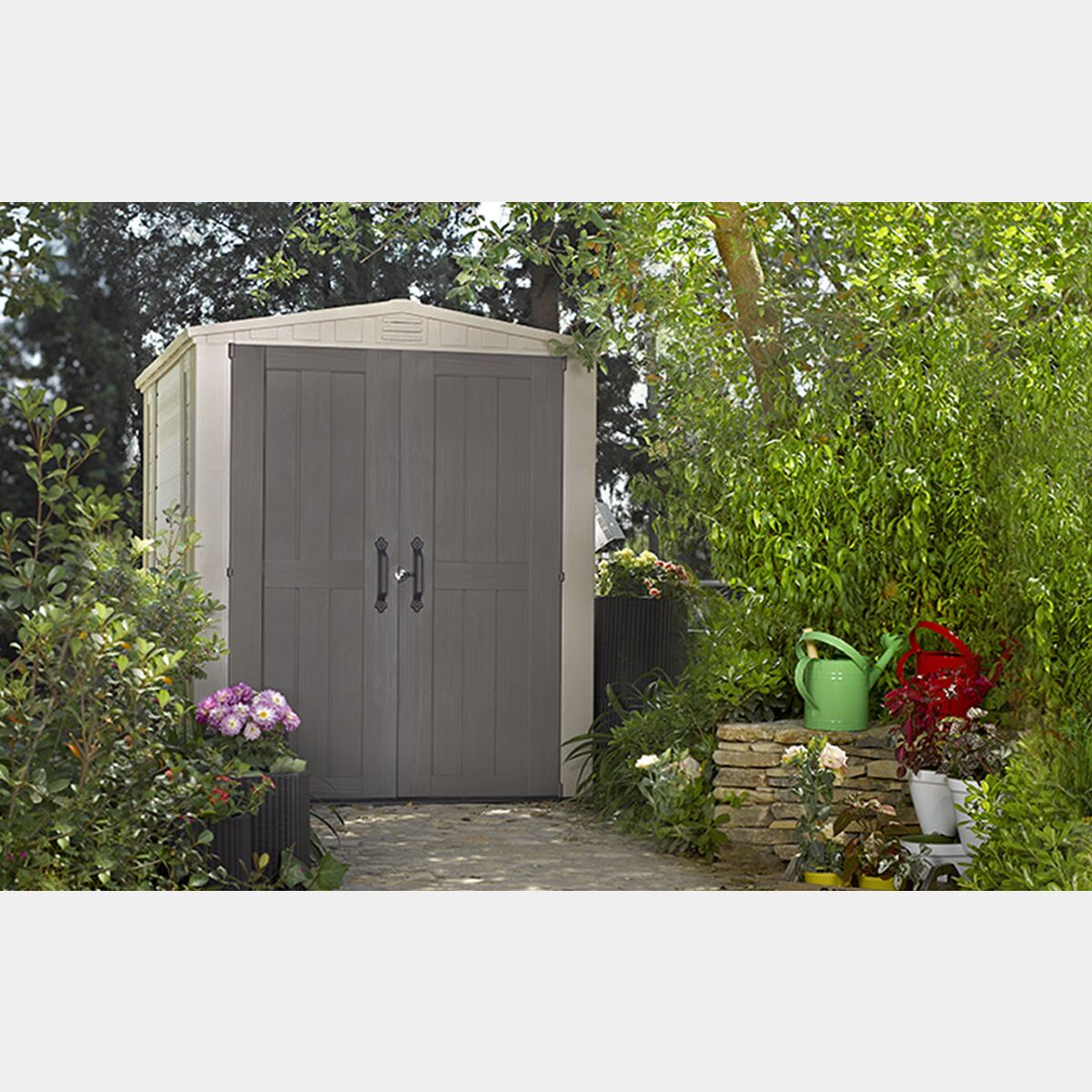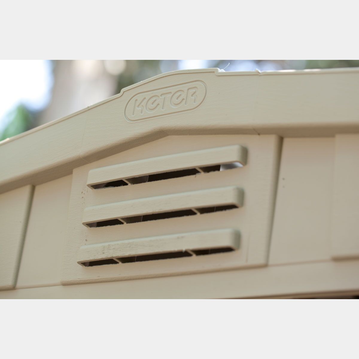 La casetta è dotata di una struttura con pareti a doppio strato e rinforzi interni in metallo. Resiste ai raggi UV e alle intemperie, sopporta i carichi neve fino a 100kg/m2 e una resistenza al vento fino a 145 km/h. Il pavimento rialzato mantiene il contenuto asciutto e pulito. La struttura è realizzata in resina e rinforzi in metallo per una migliore stabilità.