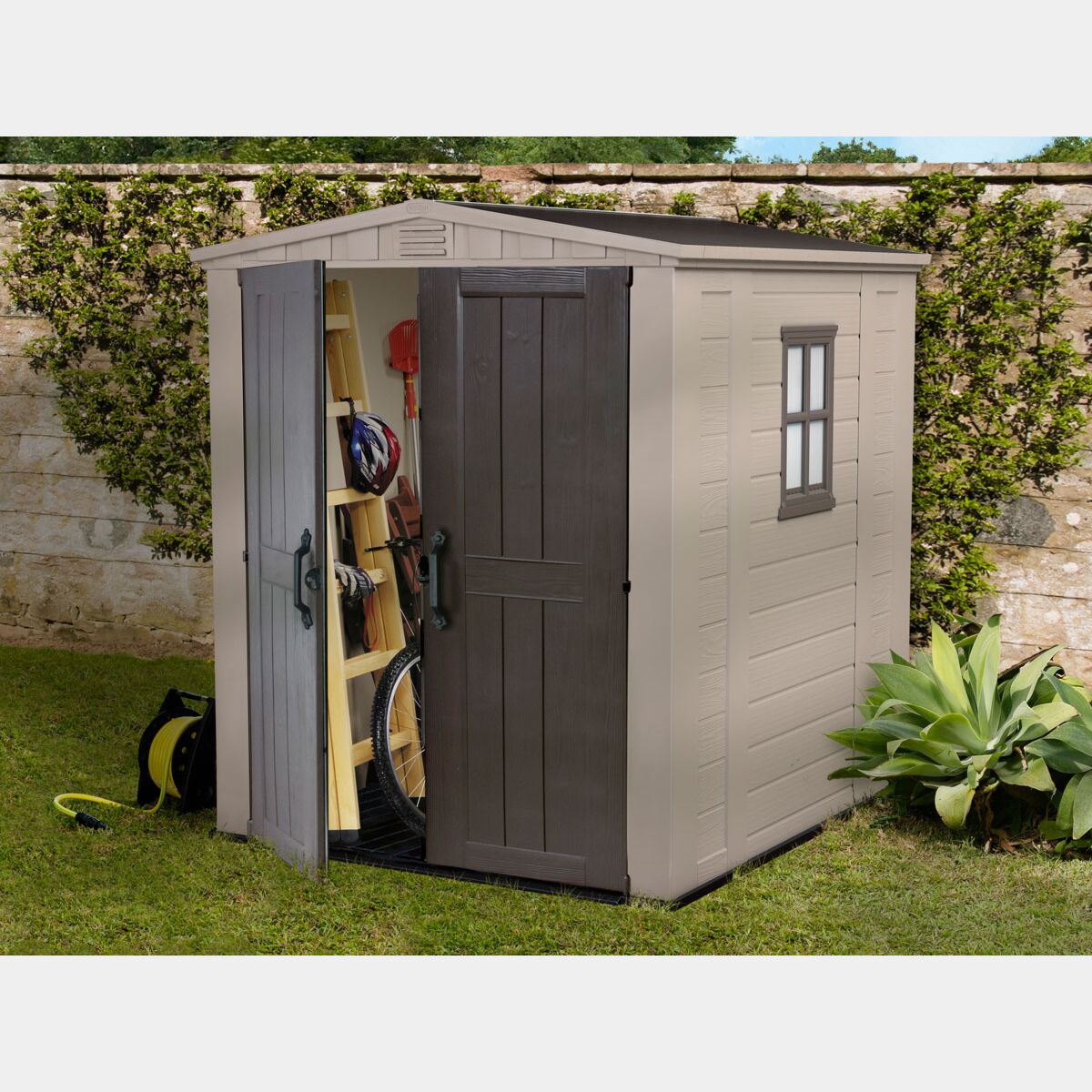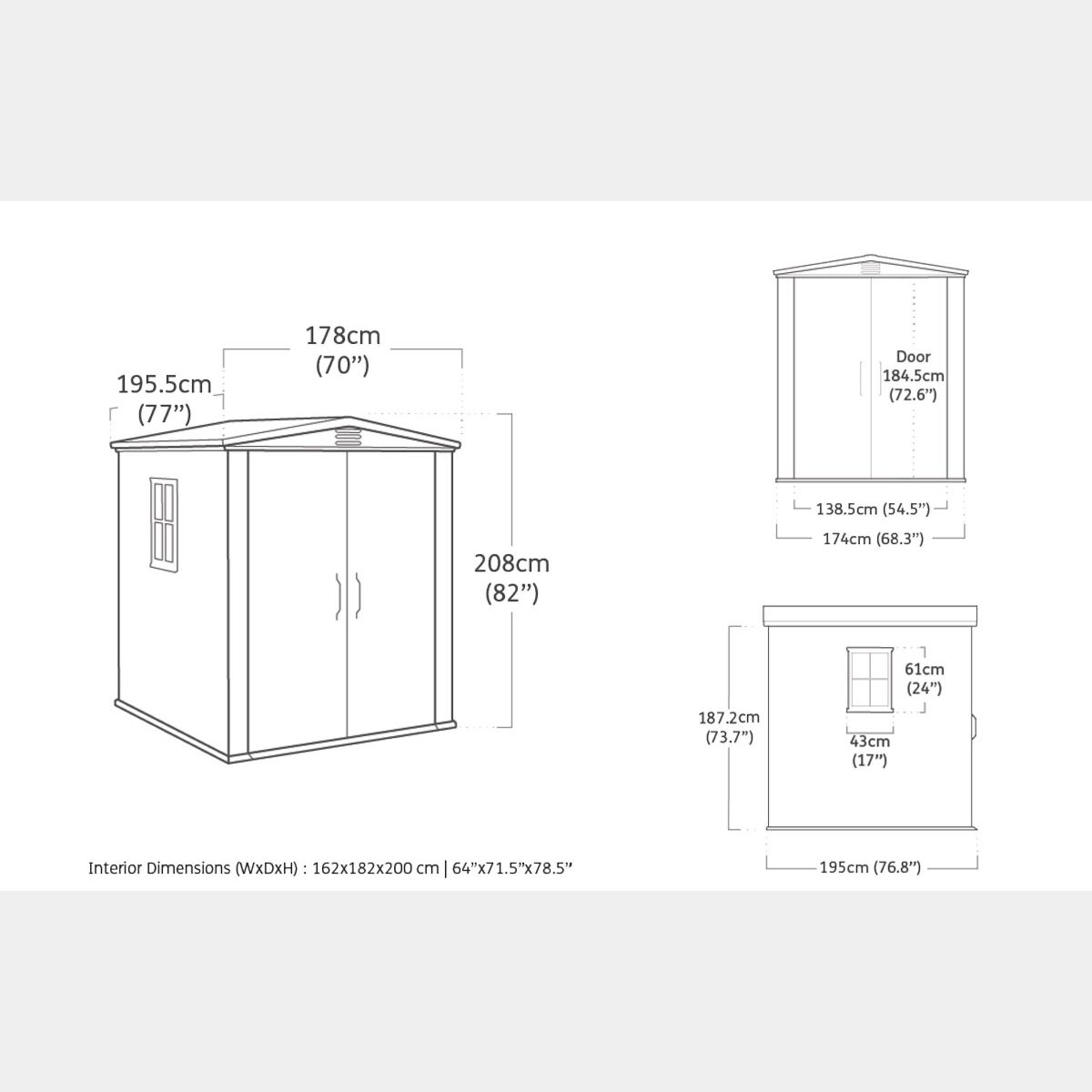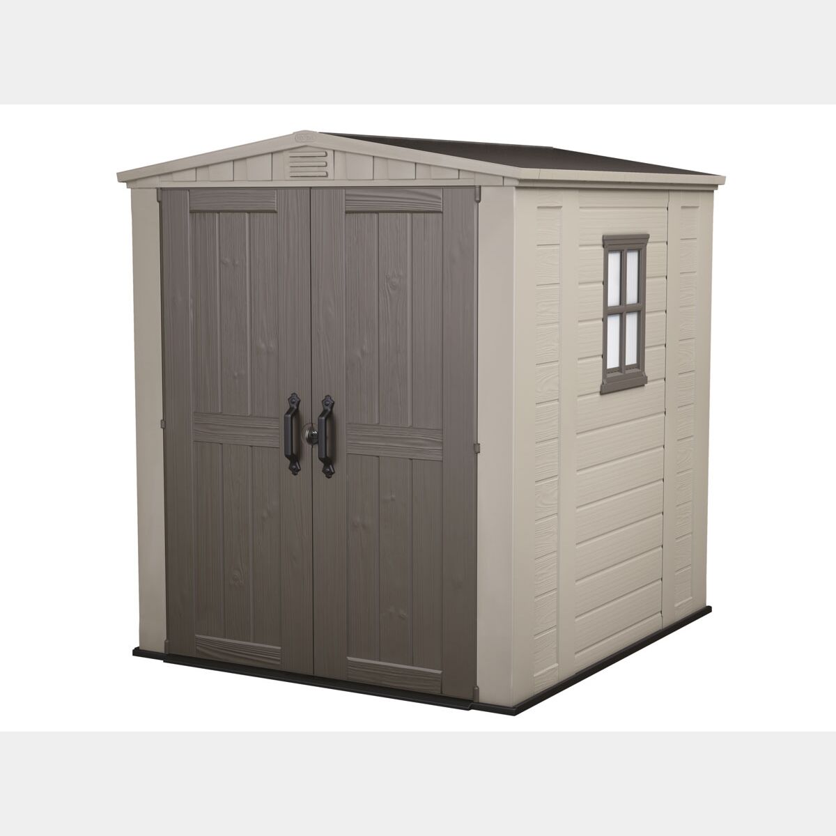 La casetta è dotata di una struttura con pareti a doppio strato e rinforzi interni in metallo. Resiste ai raggi UV e alle intemperie, sopporta i carichi neve fino a 100kg/m2 e una resistenza al vento fino a 145 km/h. Il pavimento rialzato mantiene il contenuto asciutto e pulito. La struttura è realizzata in resina e rinforzi in metallo per una migliore stabilità.