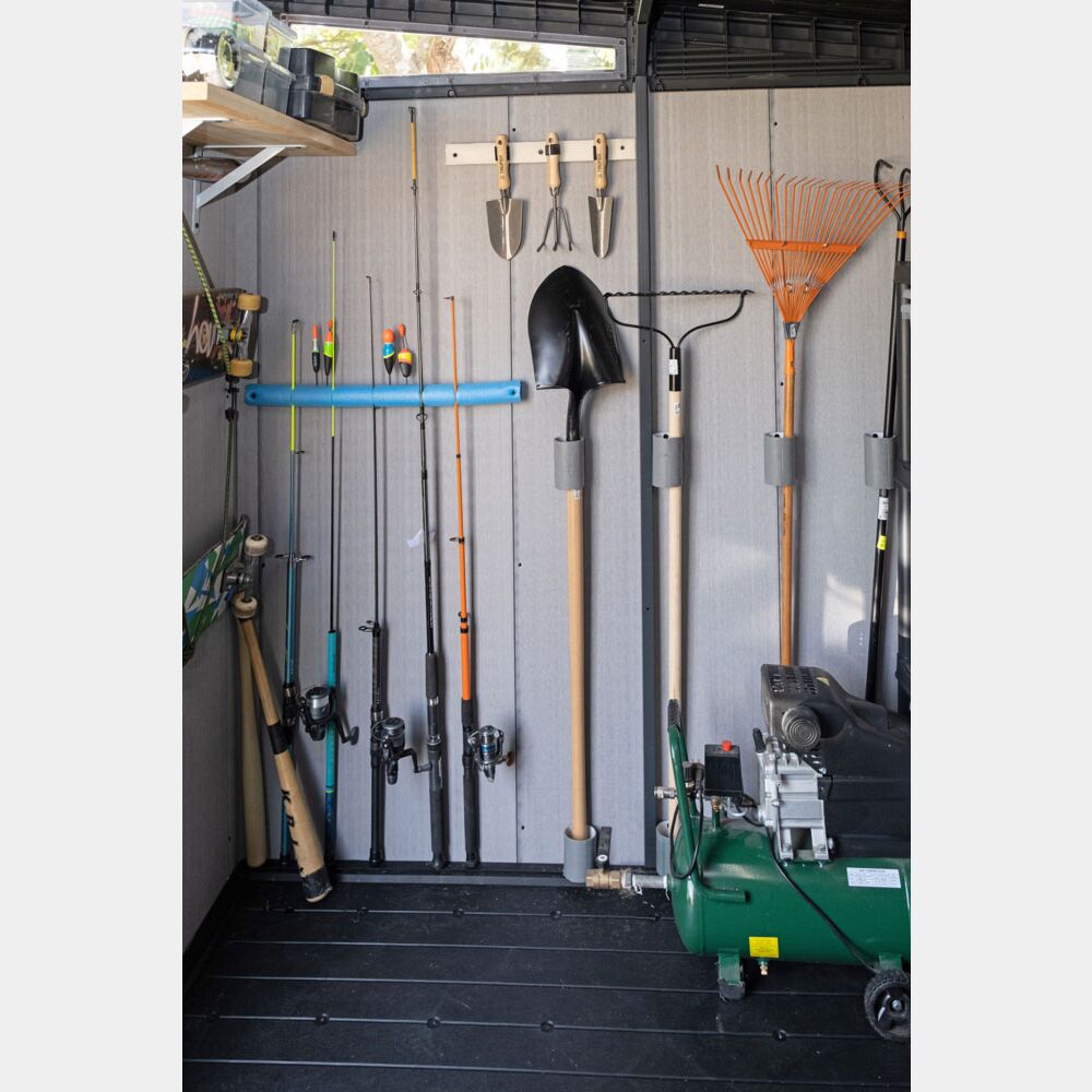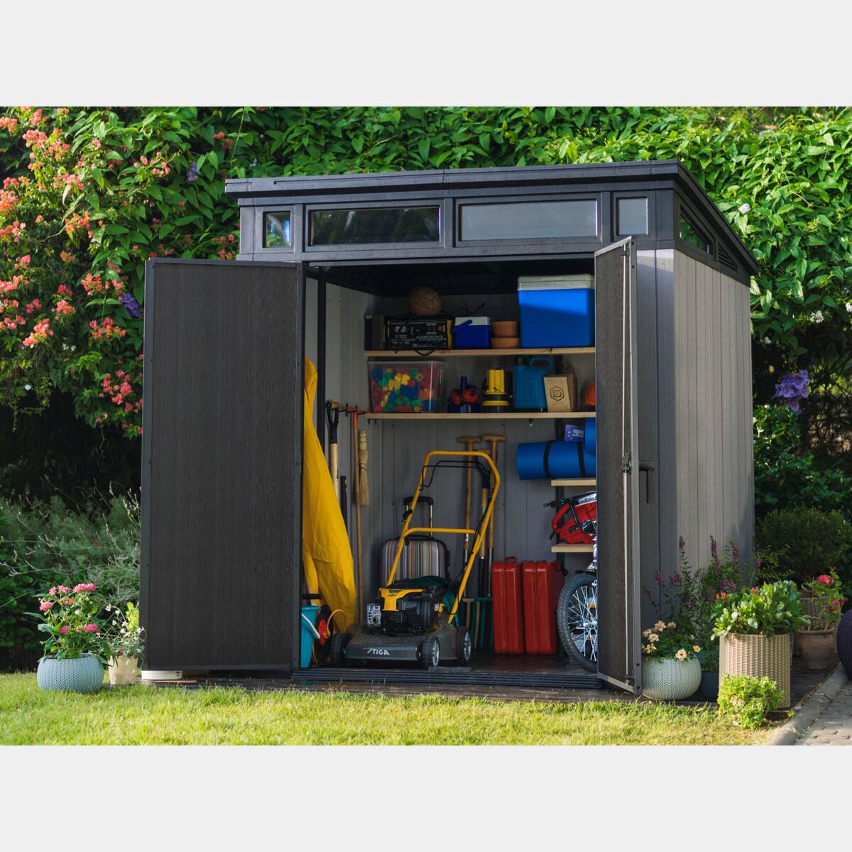 La casetta comprende anche una porta a due ante lucchettabile, finestre su 3 lati e un pavimento rialzato che protegge il contenuto da fango e pioggia.