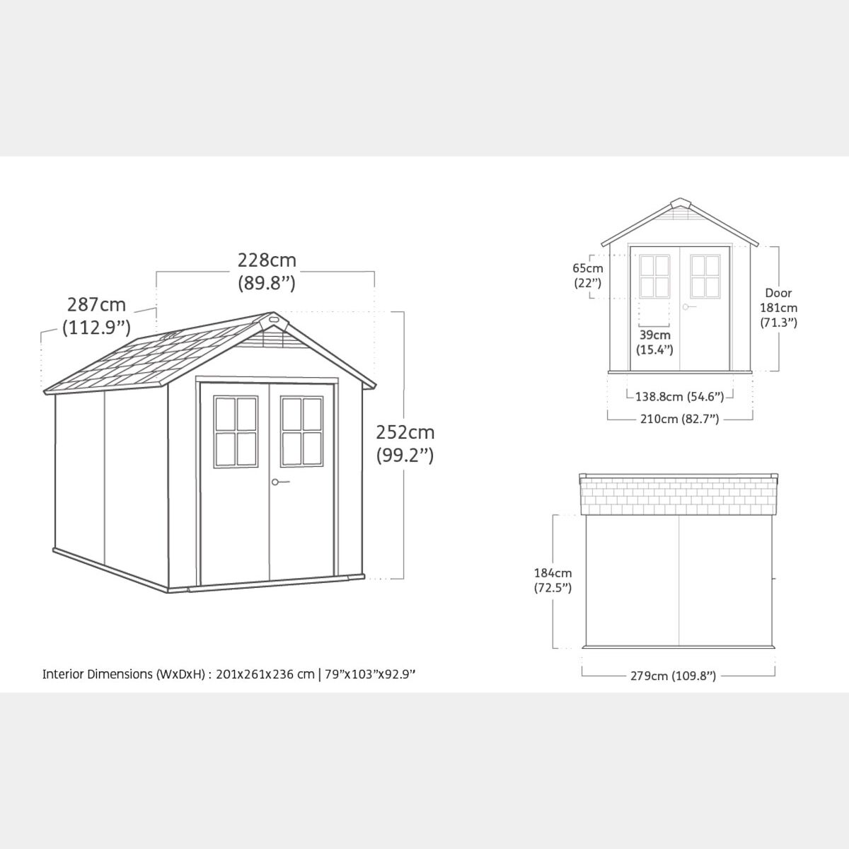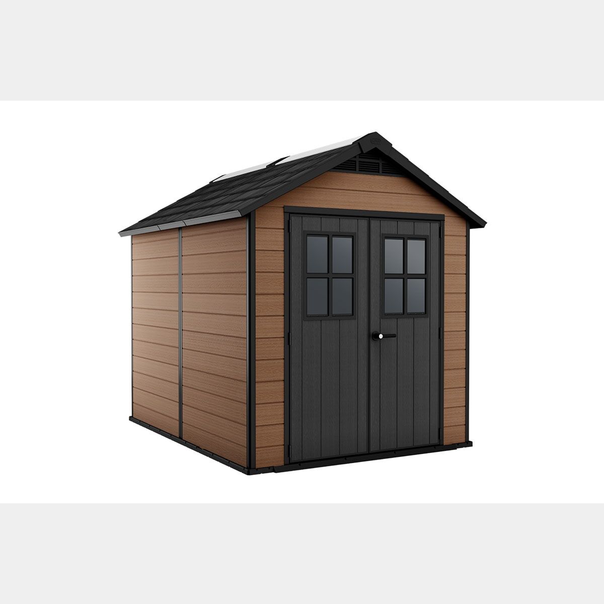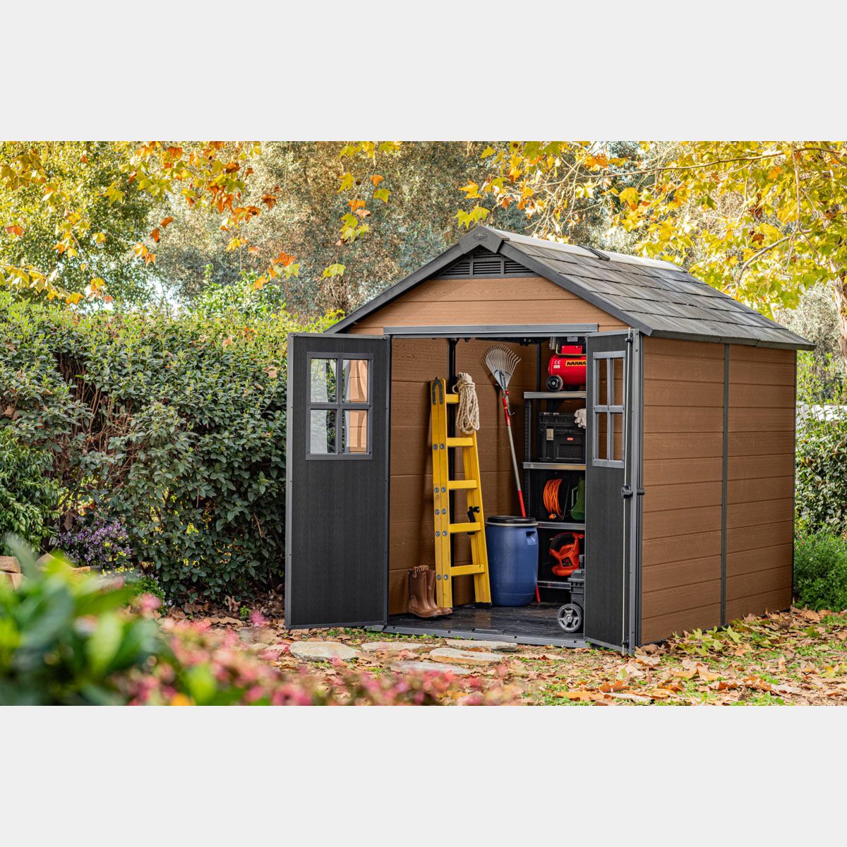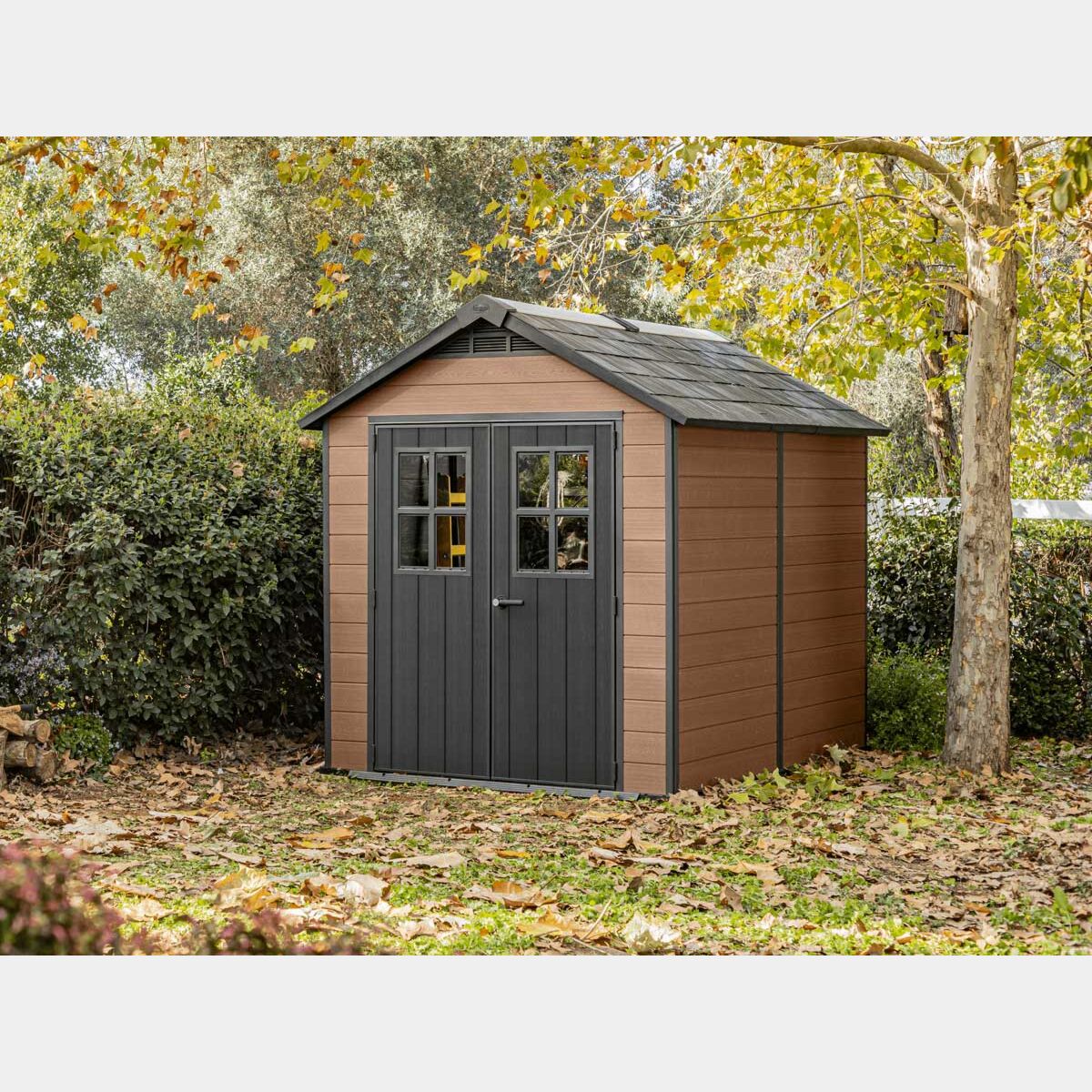 Casetta dal design classico con tradizionale finitura effetto legno, dotata di elevata resistenza e durabilità. La struttura realizzata con pannelli a doppia parete e con rinforzi in metallo resistente anche agli agenti atmosferici estremi. Il pavimento rialzato protegge il contenuto da fango e acqua, mentre il lucernario e le due finestre frontali forniscono alla casetta un'illuminazione naturale. La casetta è dotata di una struttura con pareti a doppi strato e rinforzi interni in acciaio.