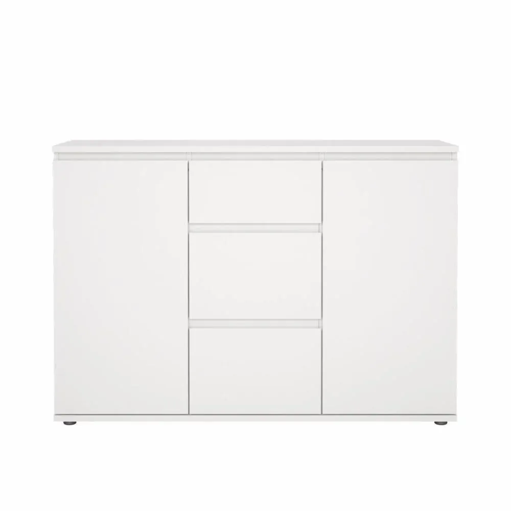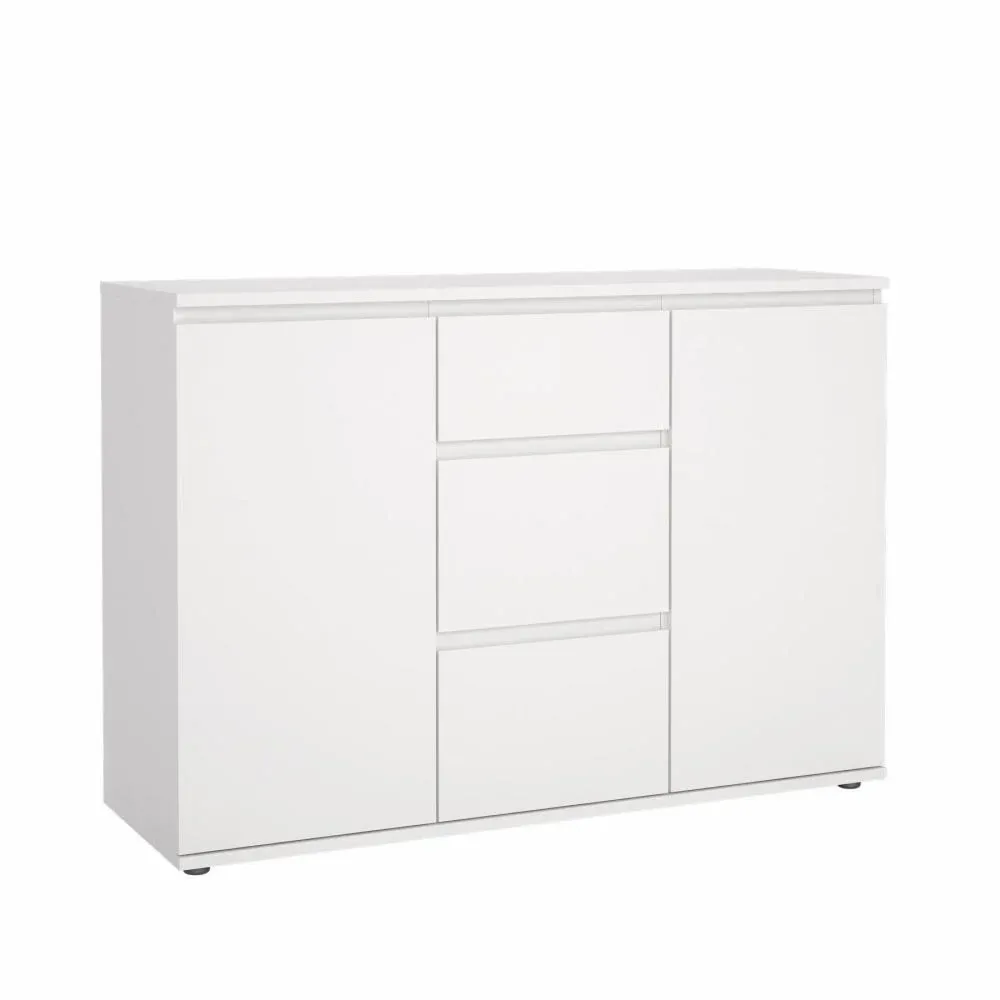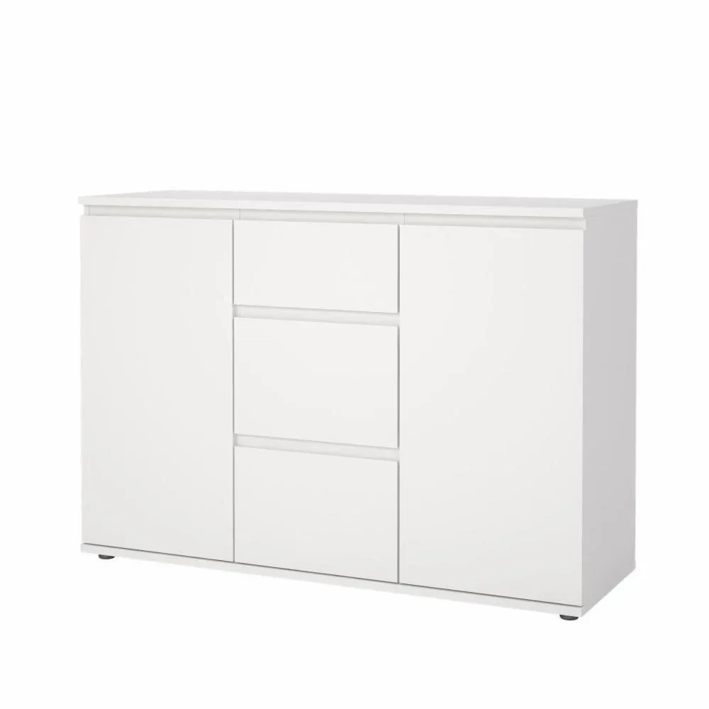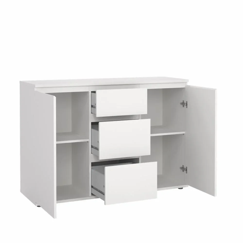 Cassettiera moderna in finitura Bianco composta da tre comodi cassetti e da due ante battenti che garantiscono un facile accesso. Al suo interno si trovano dei ripiani in cui è possibile inserire i propri oggetti in ordine. La sua grafica è lineare e minimalistica che dona un senso di calore e di pulizia all'intera stanza.