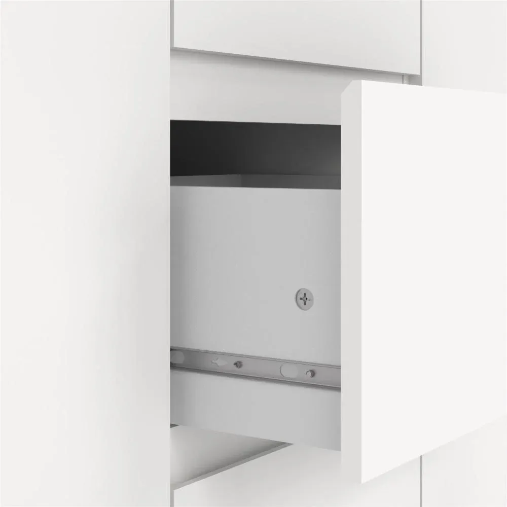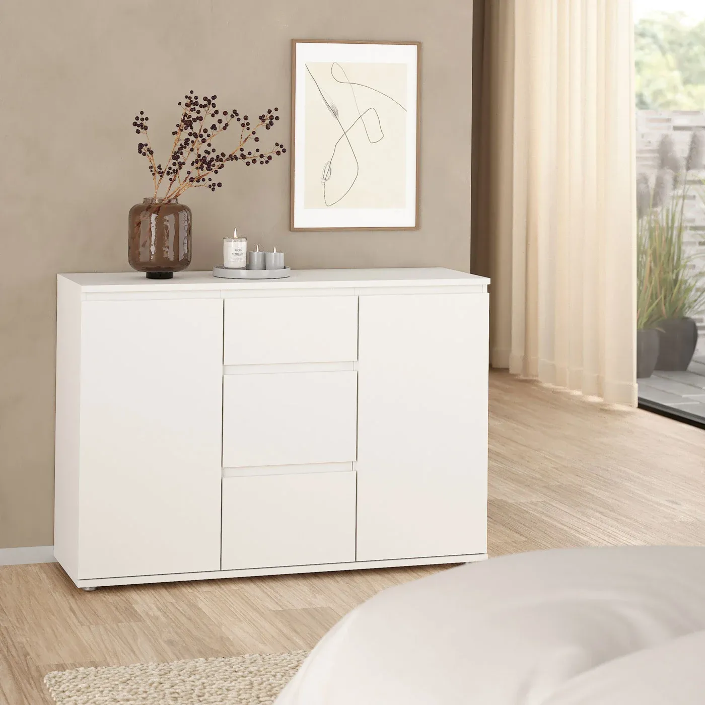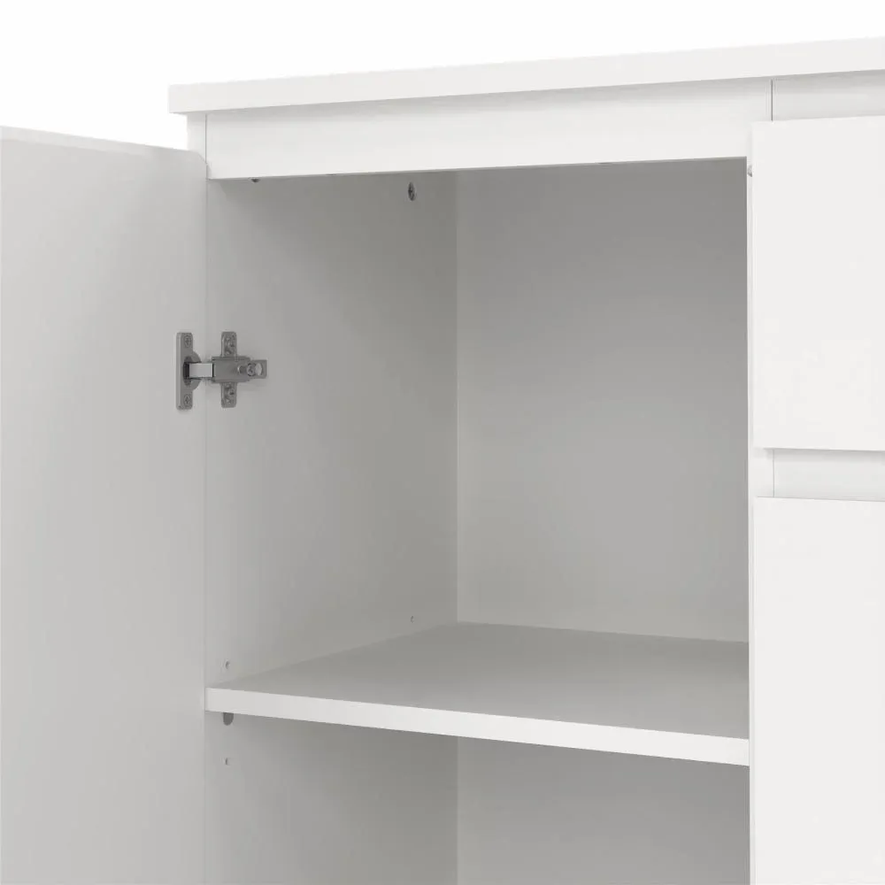 Cassettiera moderna in finitura Bianco composta da tre comodi cassetti e da due ante battenti che garantiscono un facile accesso. Al suo interno si trovano dei ripiani in cui è possibile inserire i propri oggetti in ordine. La sua grafica è lineare e minimalistica che dona un senso di calore e di pulizia all'intera stanza.