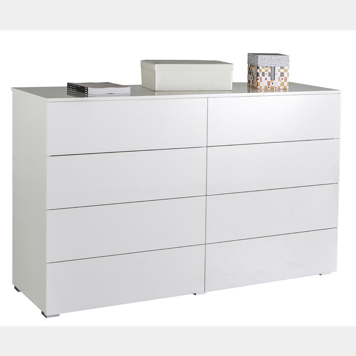 Il comò presenta un design semplice ma elegante. Dotato di 8 capienti cassetti offre la praticità necessaria nel quotidiano mentre la finitura in Bianco laccatto illumina l'ambiente donando calore e rendendolo accogliente.