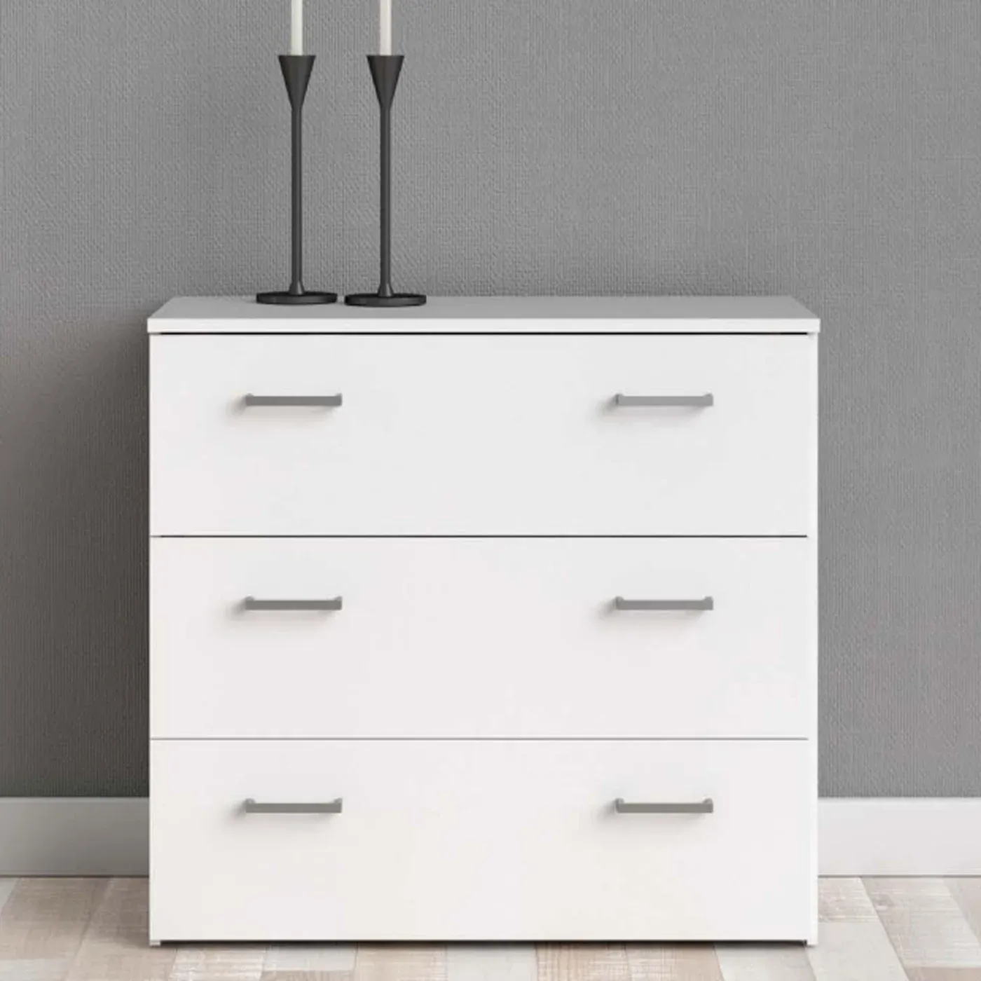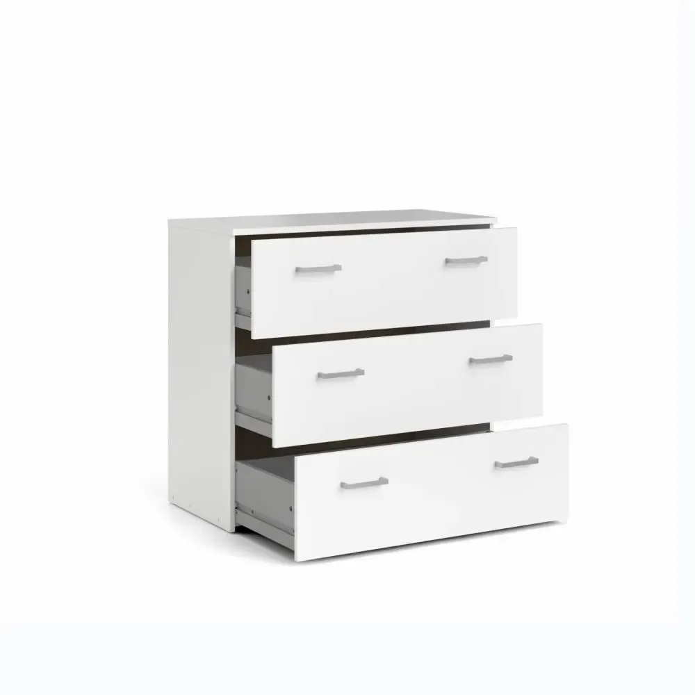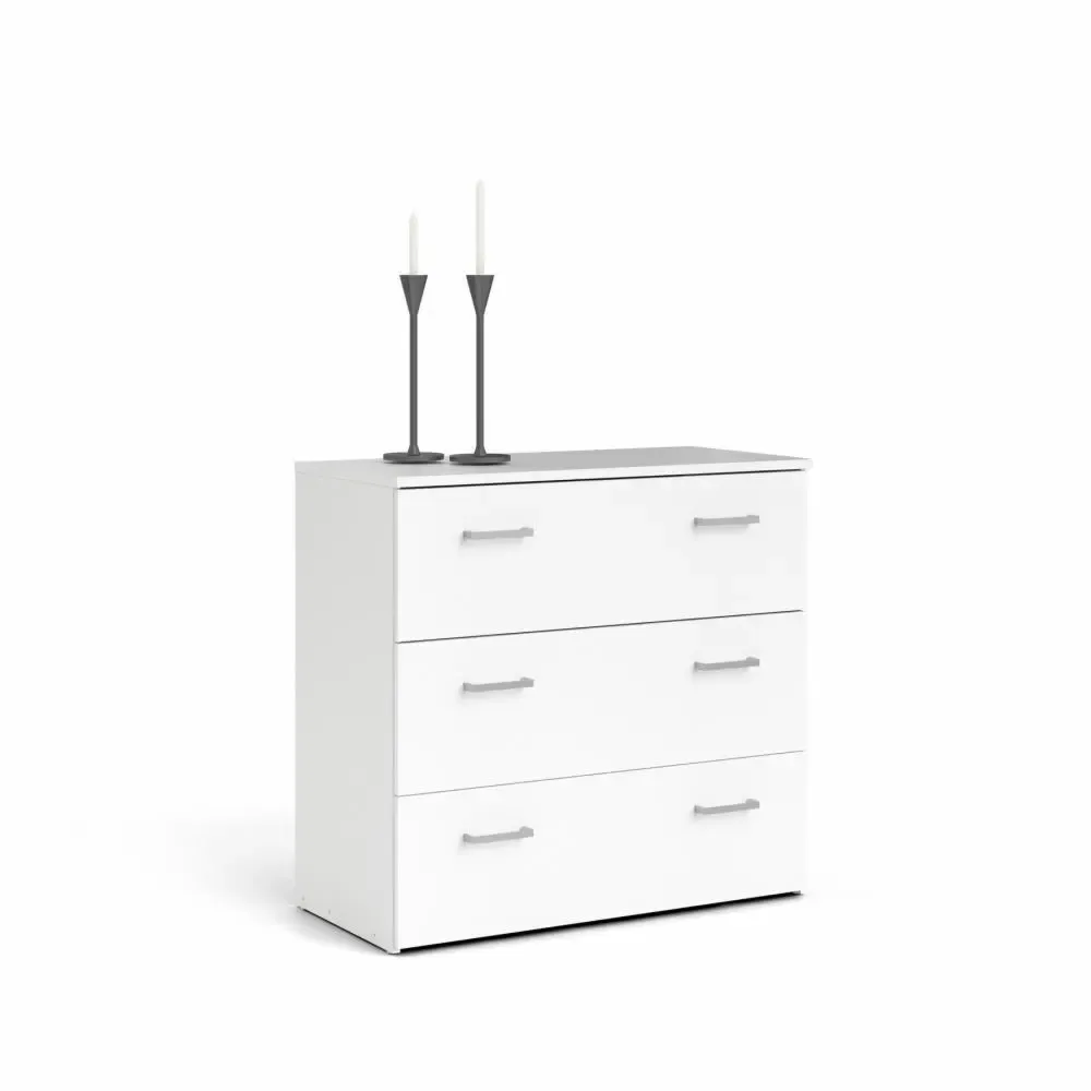 Cassettiera con tre cassetti color Bianco con sei maniglie. E' capiente per riporre i propri oggetti in ordine.