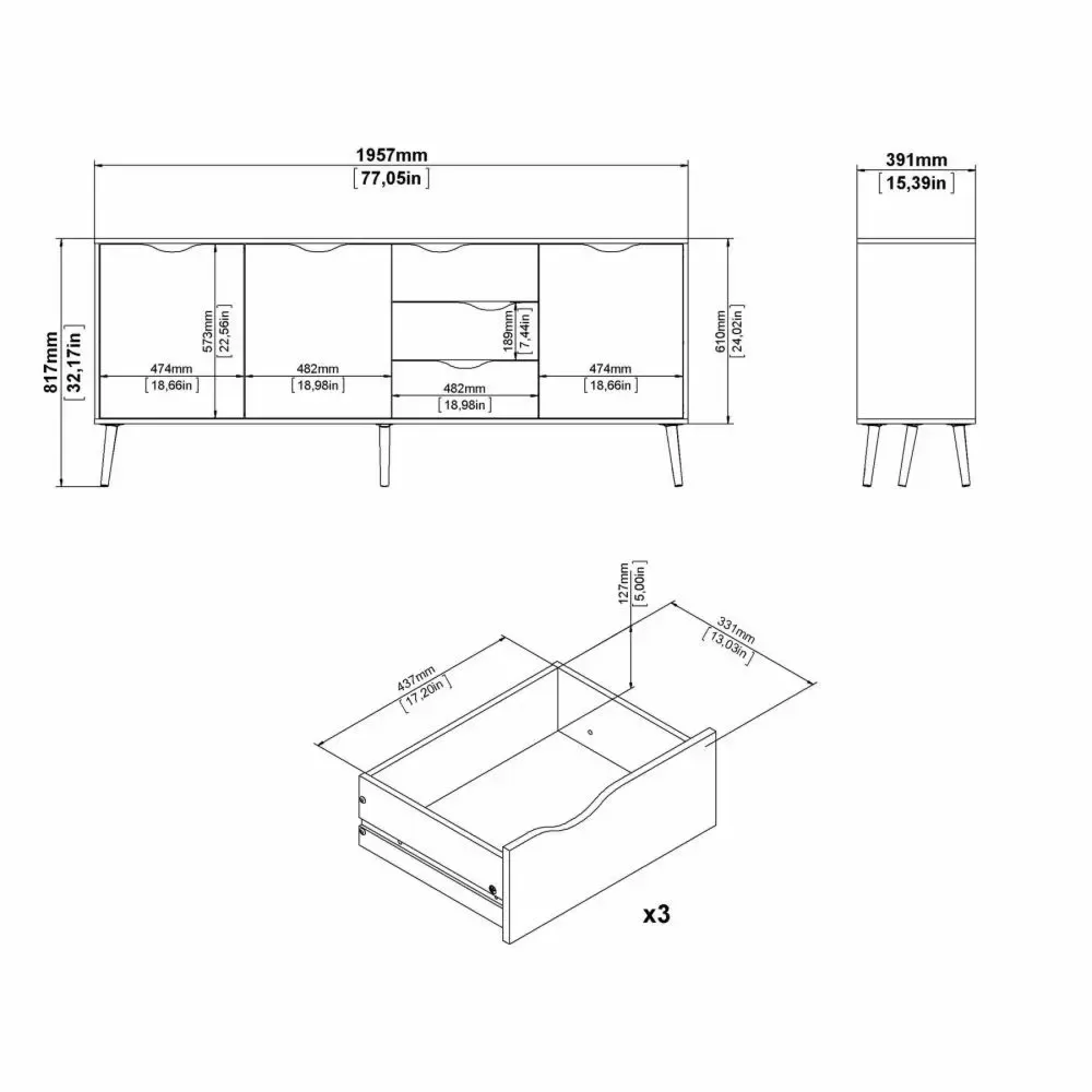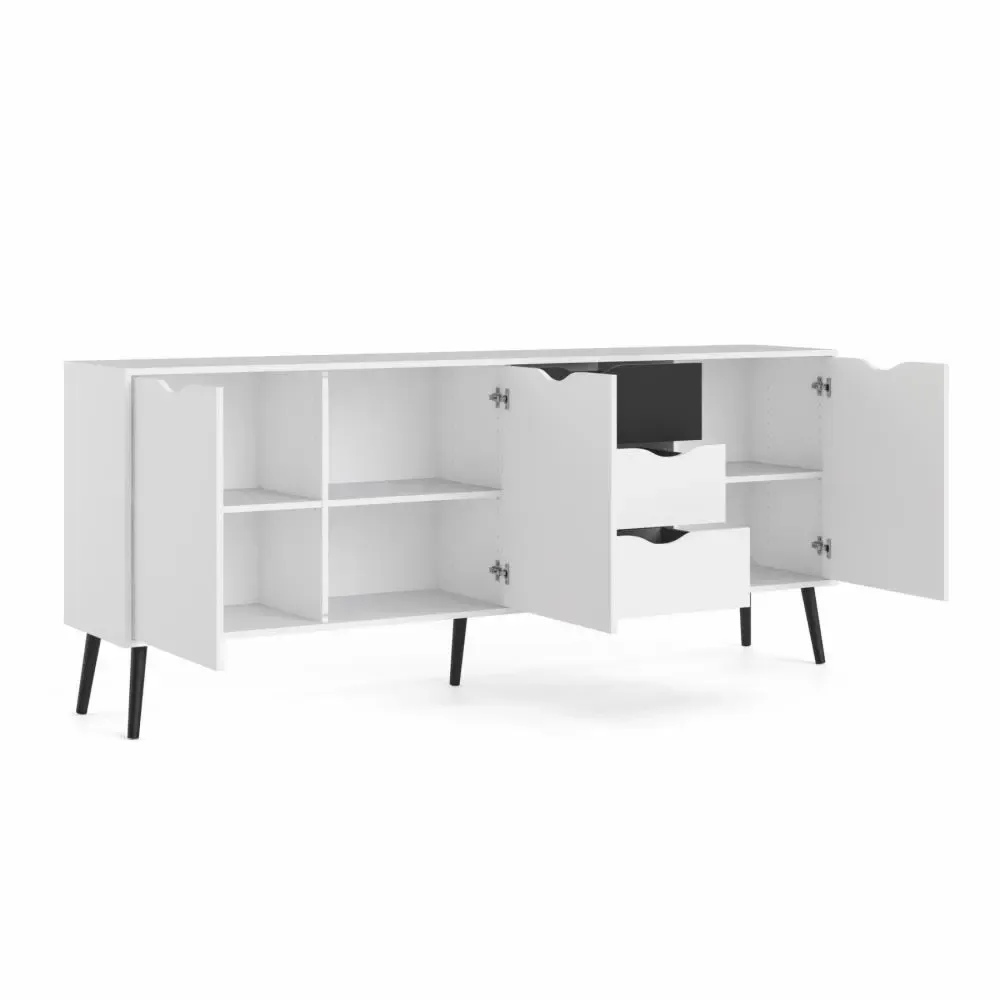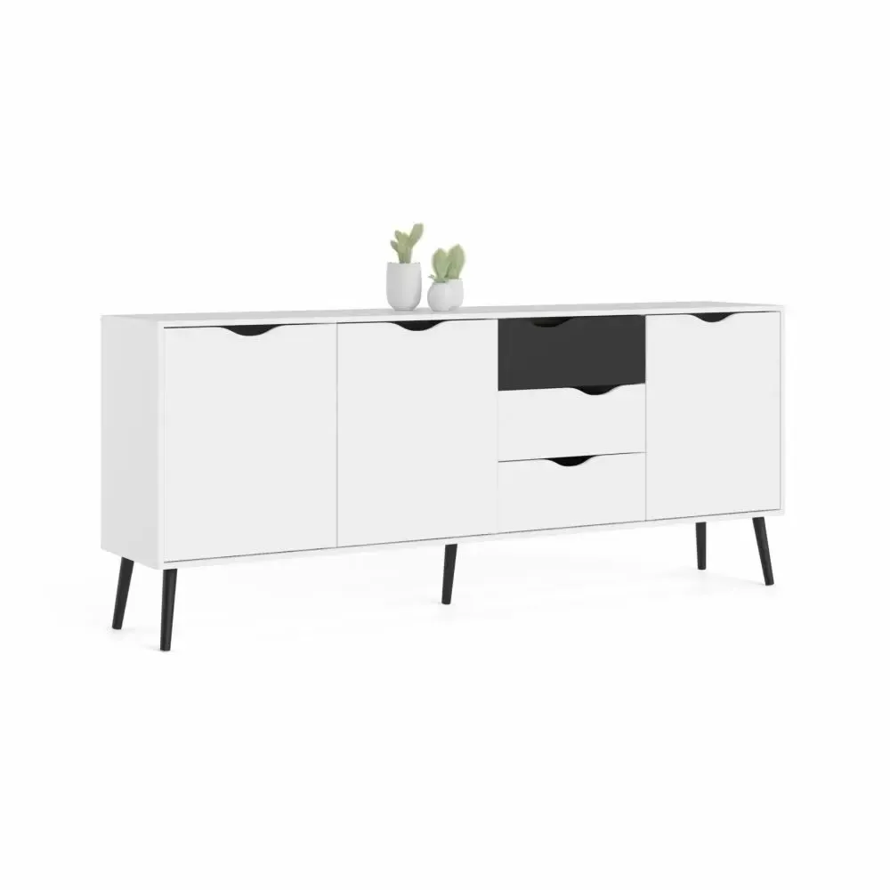La madia è caratterizzata da tre cassetti e tre ante di colore Bianco e Nero opaco. La madia grazie al suo design nordico si può inserire in soggiorno. La madia è molto spaziosa per ospitare diversi oggetti. E' disponibile anche in versione Bianco e Rovere.
