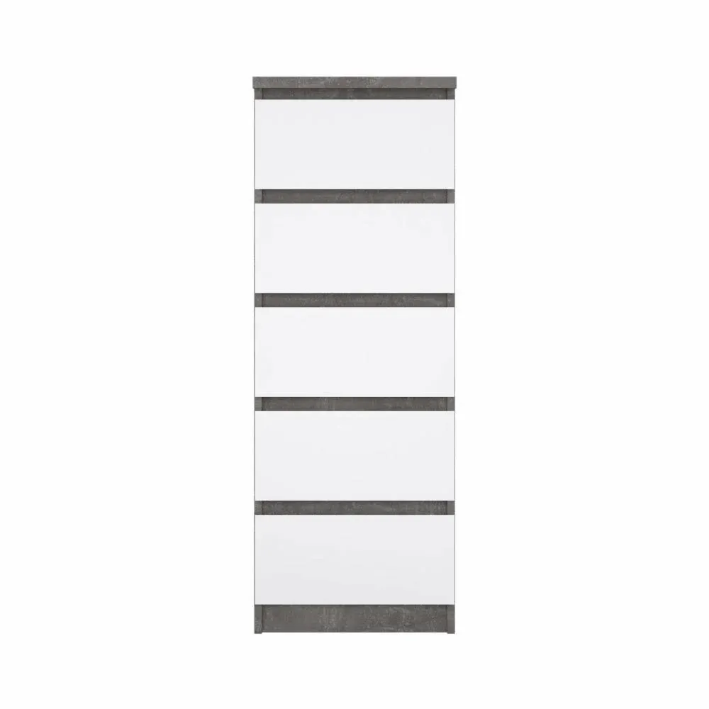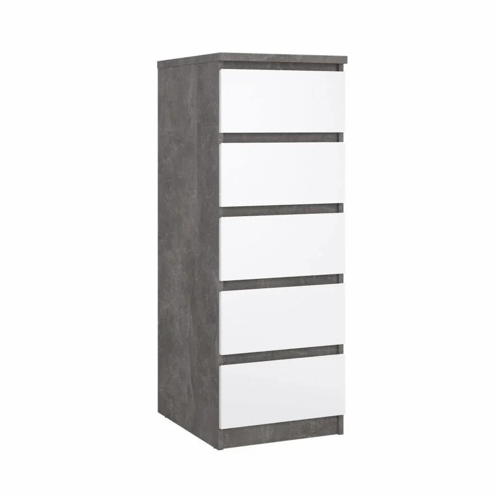 Cassettiera con cinque cassetti colore Calcestruzzo e Bianco lucido. E' disponibile in versione Nero opaco, Rovere, Bianco lucido