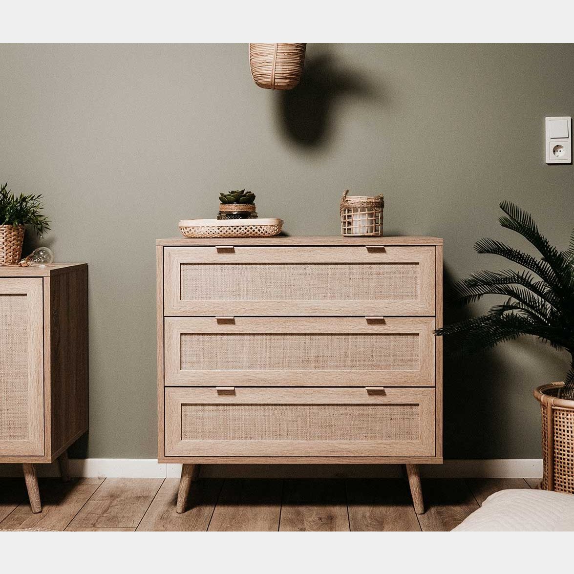 La cassettiera presenta un design semplice ma di impatto. Grazie infatti alla sua delicata finitura in quercia e l'effetto rafia presente nei cassetti, dona luce e rende accogliente l'ambiente.