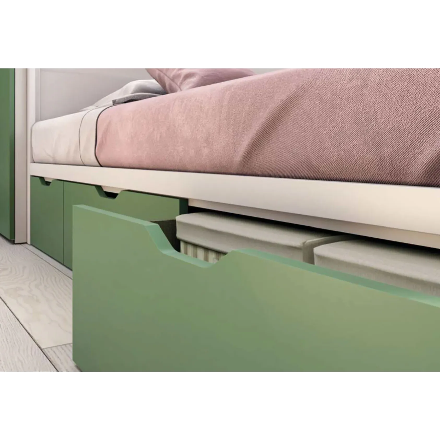 L’attenzione per lo spazio è un imperativo. Sotto il letto trovano posto tre comodi cestoni per riporre scatole, coperte e biancheria, che altrimenti occuperebbero troppo volume nell’armadio.