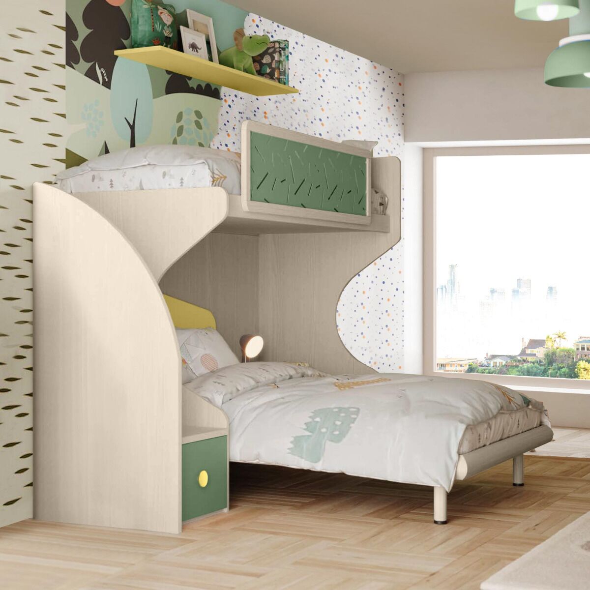 Castello per camerette con letto 1 piazza e mezza, finitura Cenere, Salvia e Giallo
