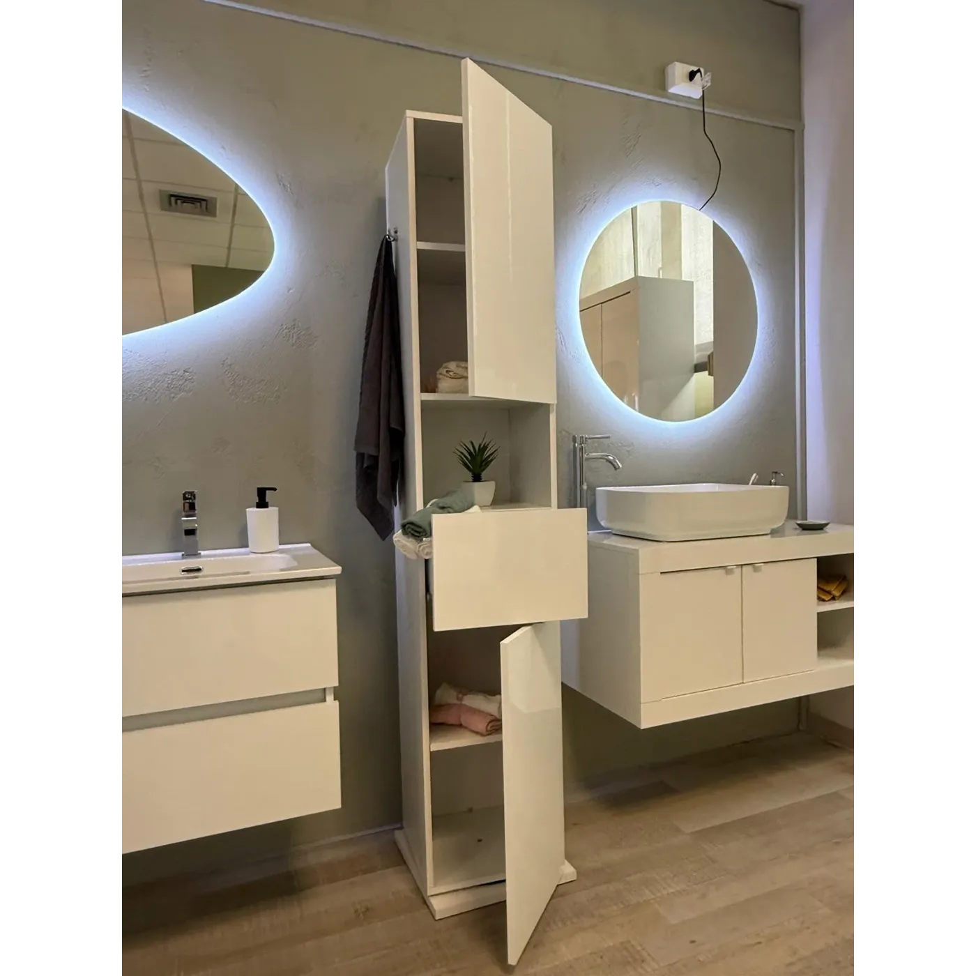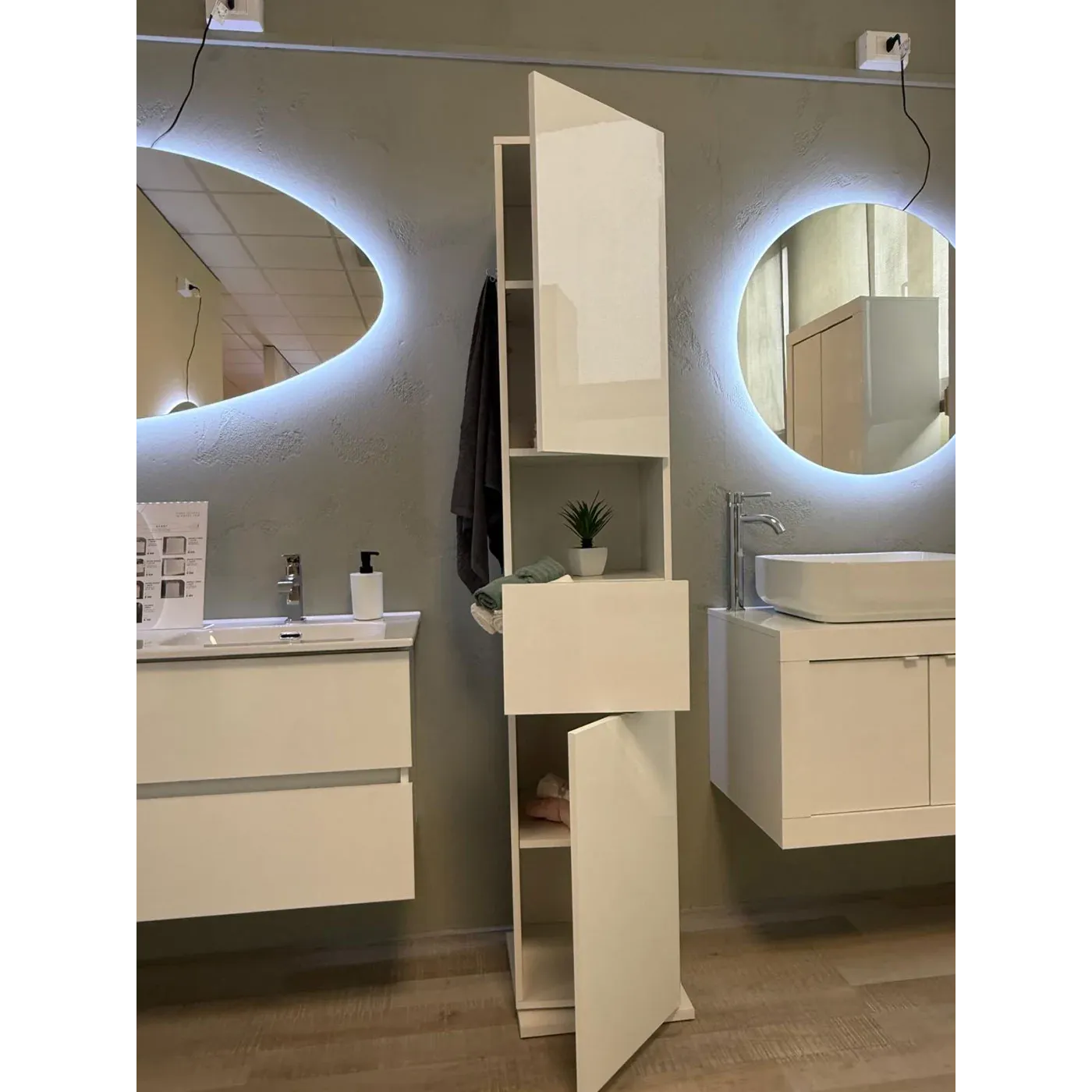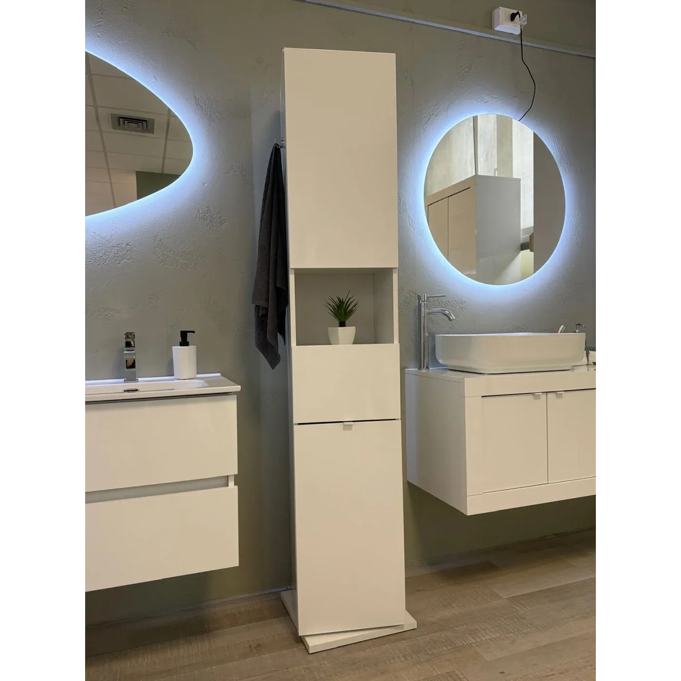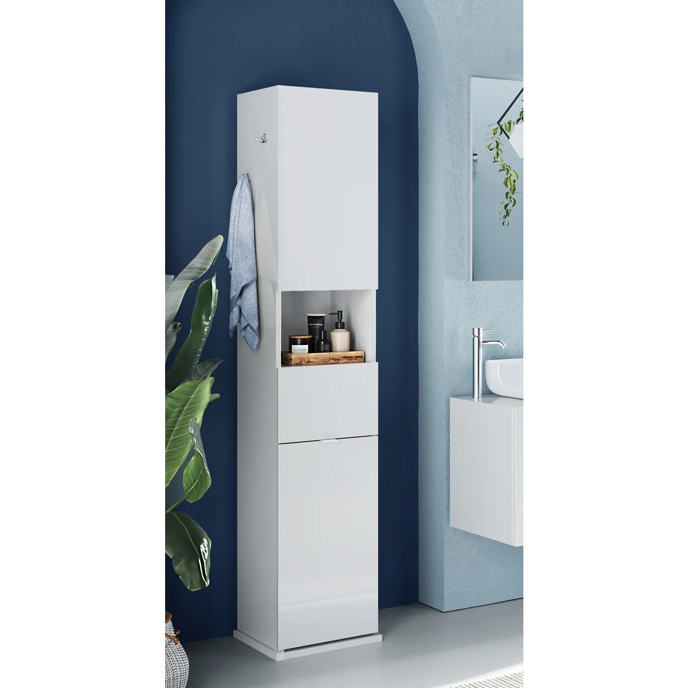 Colonna da bagno con 2 ante, un vano al centro per contenere prodotti da bagno, 2 ganci appendi-accappatoio, un cassetto, 2 ripiani interni e uno specchio posto sul retro.