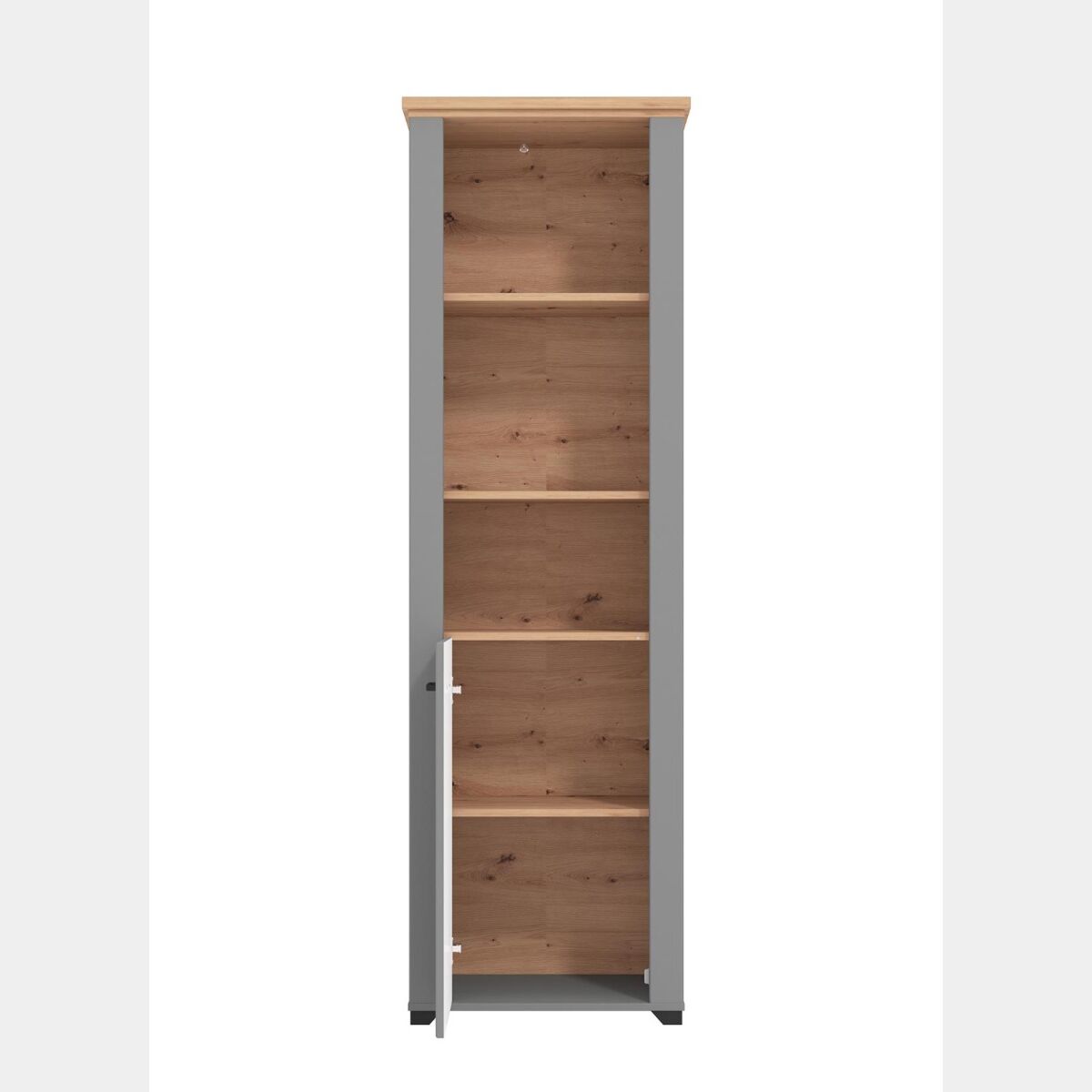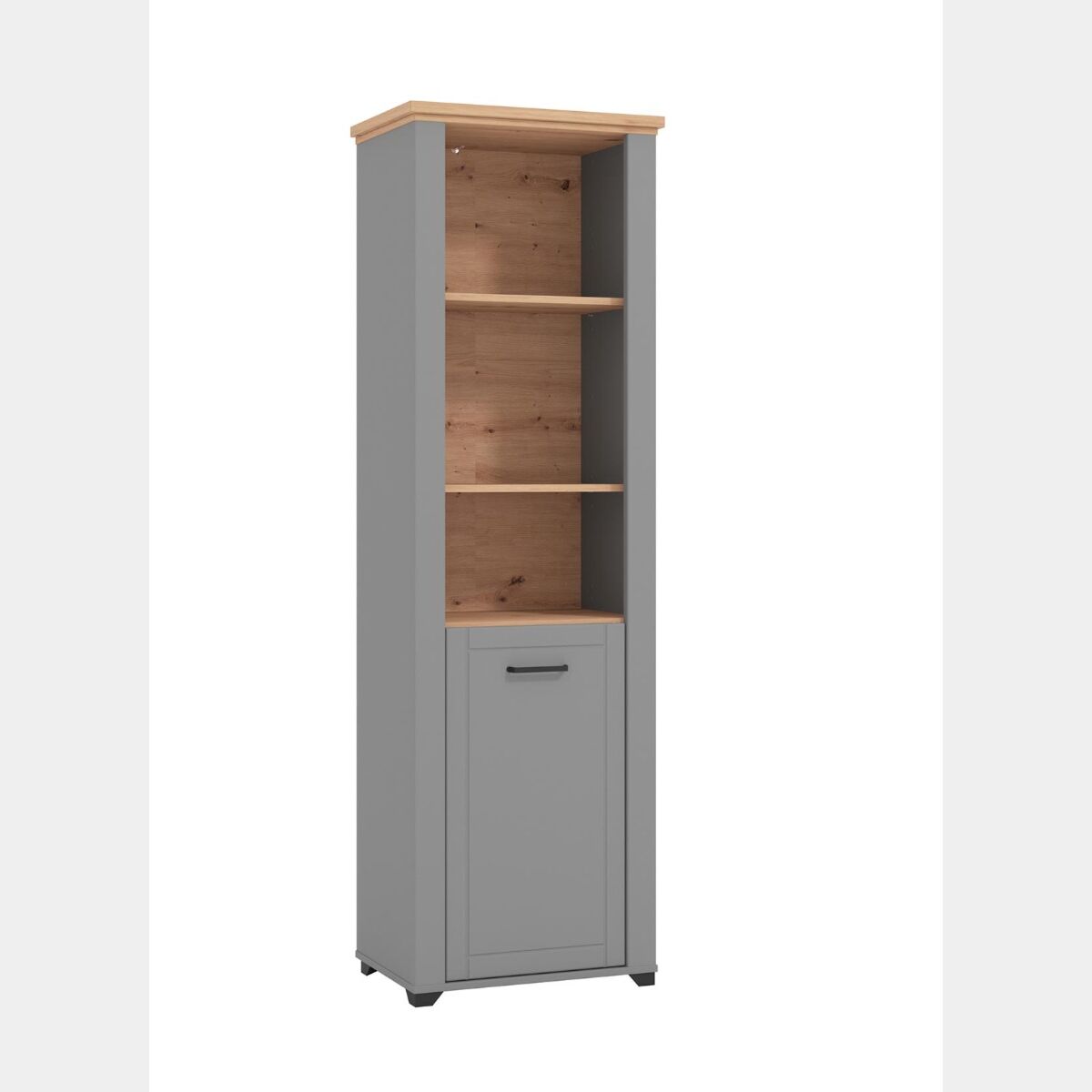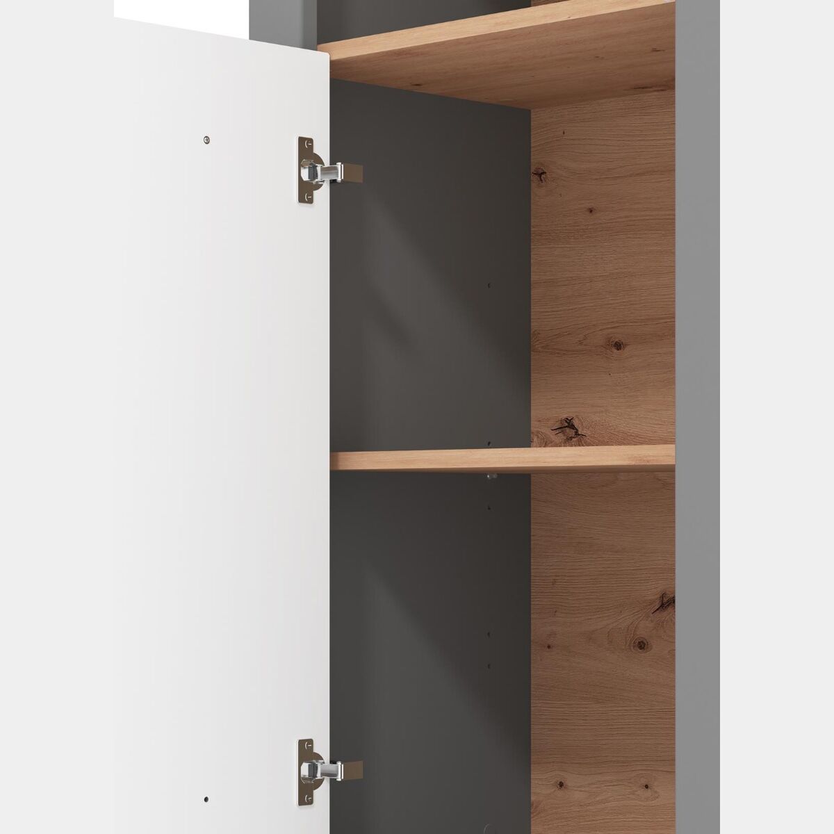 Linee decise caratterizzano la colonna multiuso, assicurando eleganza e ricercatezza all'ambiente. Due sono le finiture che caratterizzano il mobile: la calda tonalità effetto legno, il Rovere, presente nel top, e l'intens o Grigio grafite. Il contrasto generato assicura un complemento d'arredo di forte impatto che viene valorizzato da sottili maniglie orizzontali nere.
