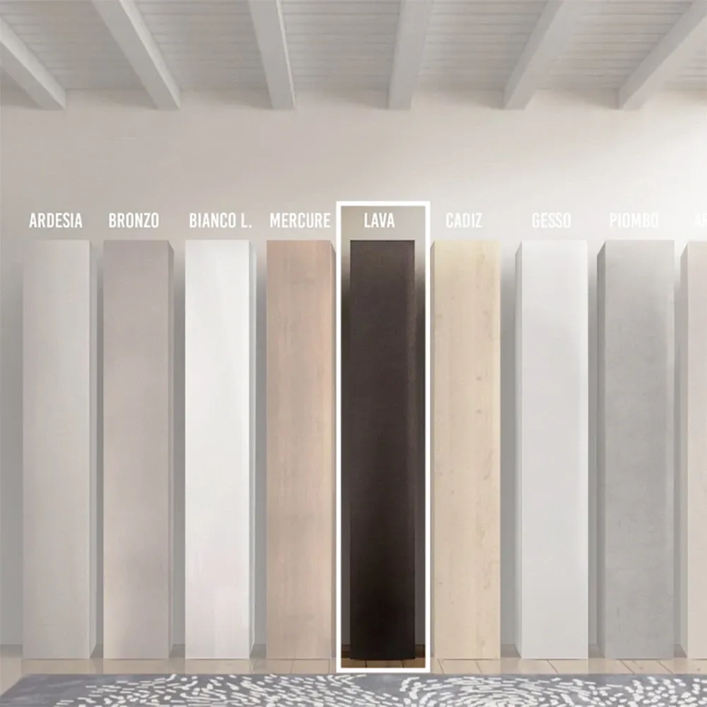 La colonna presenta quattro ripiani interni, la finitura Lava può essere sostituita con altre colorazioni, disponibii a campionario.