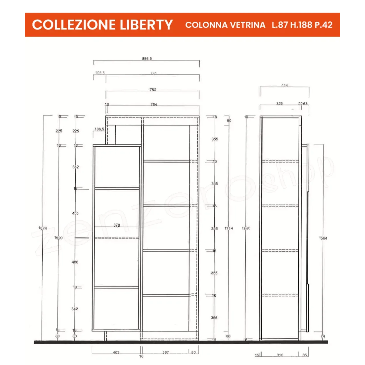 La vetrina è composta da due ante: in quella di sinistra vi sono tre ripiani interni mentre in quella di destra quattro.
