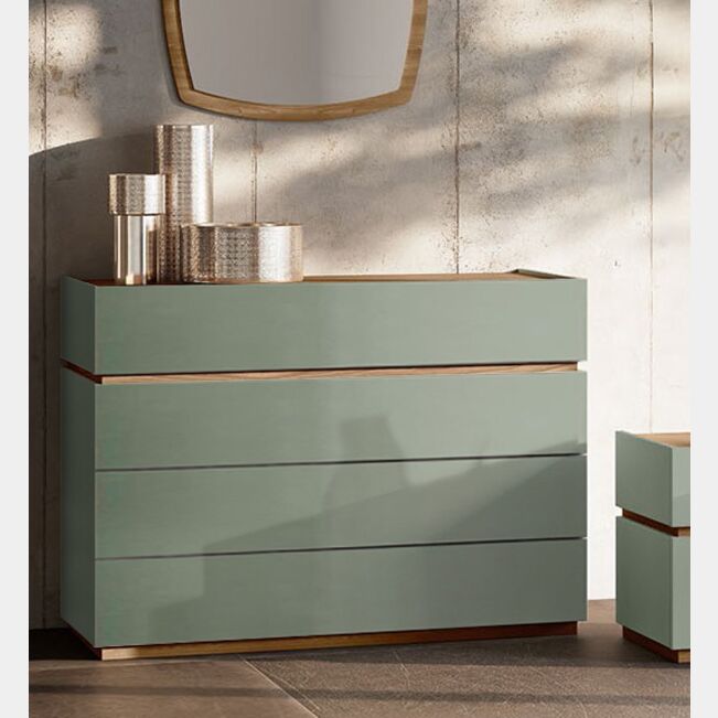 Il comò è composto da 4 cassetti, il cassetto superiore puo essere di finitura diversa rispetto ai tre inferiori oppure nella stessa finitura (come in foto). In foto tutti 4 i cassetti sono in finitura agave. Zoccolo, gola e top in noce biondo.