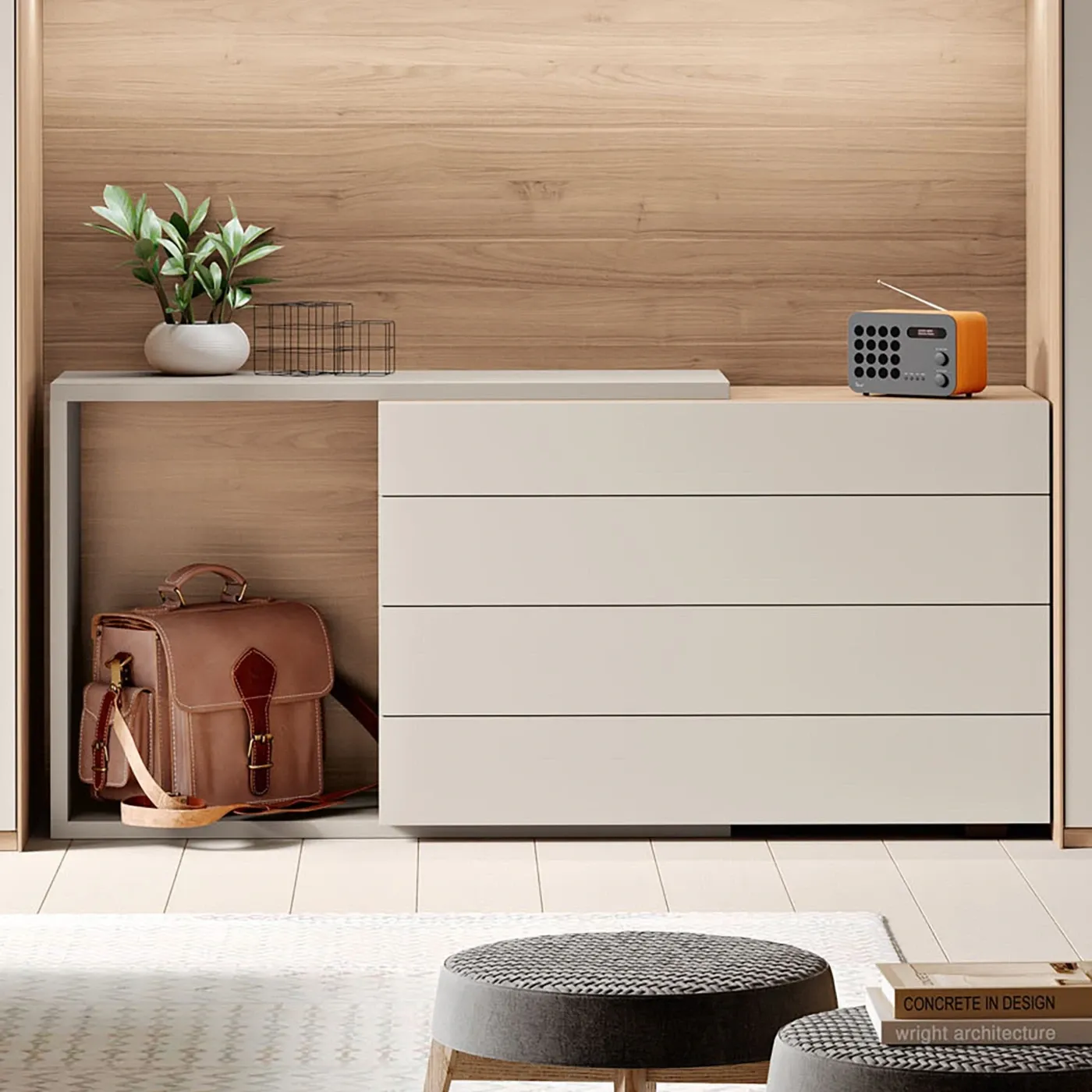I 4 ampi cassetti presentano eleganti frontali che richiamano le venature naturali del legno, offrendo uno spazio comodo e capiente per ogni tipo di abbigliamento. La solidità è un punto di forza, garantita dallo spessore dei pannelli della scocca, che varia tra i 18 e i 30 millimetri.