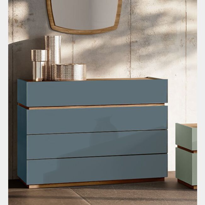 Il comò è composto da 4 cassetti, il cassetto superiore puo essere di finitura diversa rispetto ai tre inferiori oppure nella stessa finitura (come in foto).In foto tutti 4 i cassetti sono in finitura petrolio. Zoccolo, gola e top in noce biondo.
