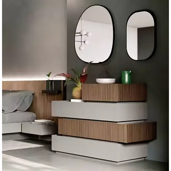 Comò 4 cassetti sfalsati, finitura Cannettato e Grigio seta