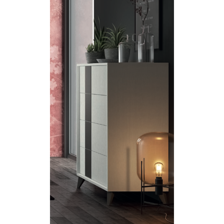 Un comò moderno ed elegante, caratterizzato dalla presenza di particolari piedini che ne aumentano la bellezza e funzionalità. I 4 capienti cassetti, dotati di chiusura rallentata, hanno un'altezza di 24 cm, forniscono per questo un ampio spazio di appoggio. I cassetti presentano meccanismo di apertura push-pull.