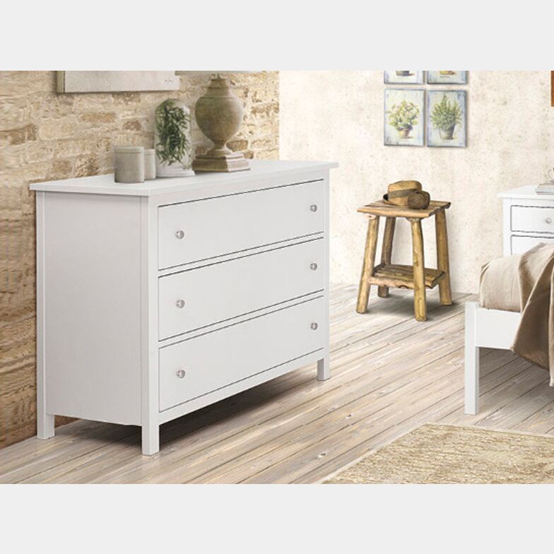 Comò in stile classico con 3 ampi cassettoni. Completo di maniglie anticate in stile con la creazione. Finitura Bianca arte povera.