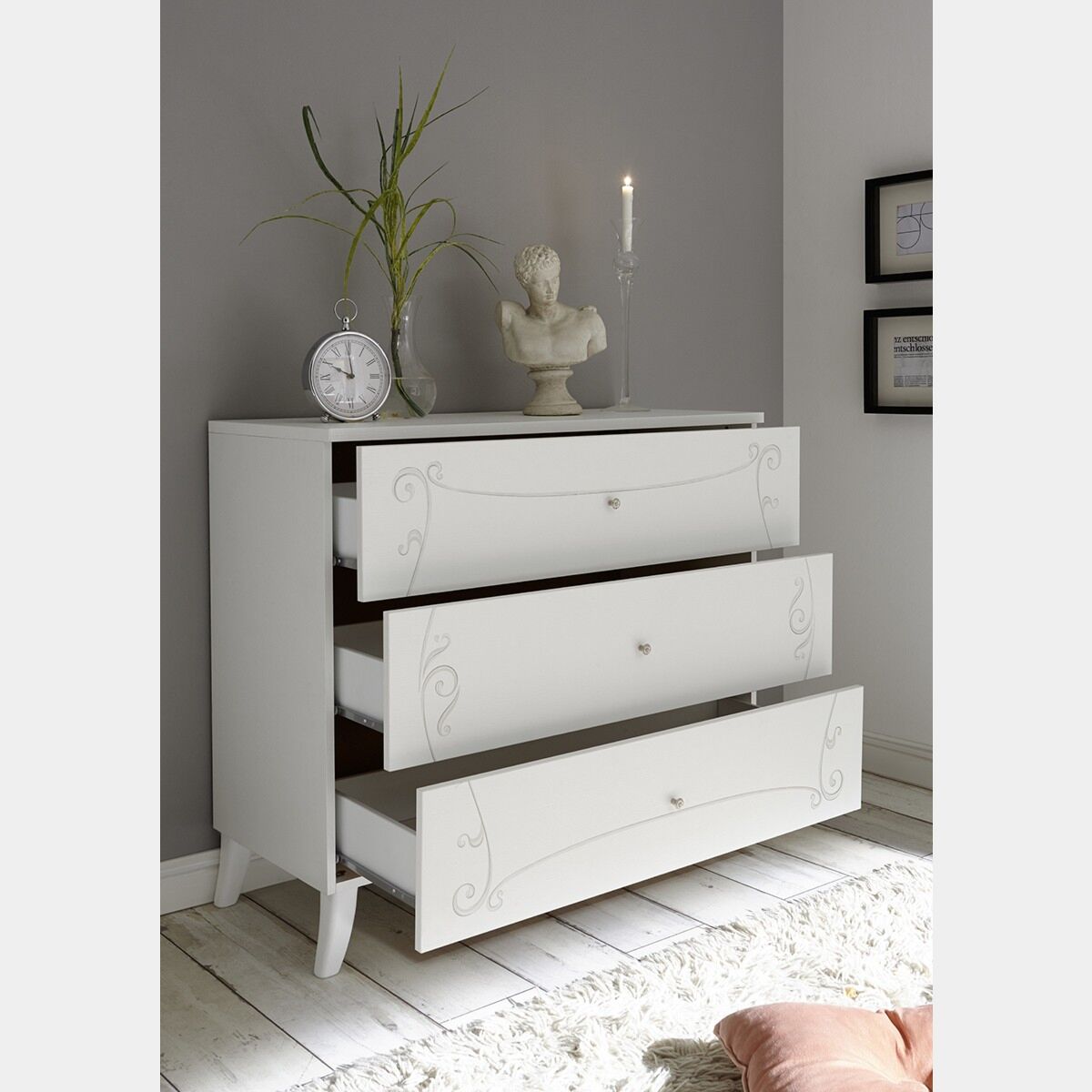 Comò di design, colore bianco avatar con frontali serigrafati e piedini in legno bianco.Tutti i prodotti sono realizzati con pannelli ecologici certificati FSC.La struttura è in finitura melaminico Bianco Avatar.