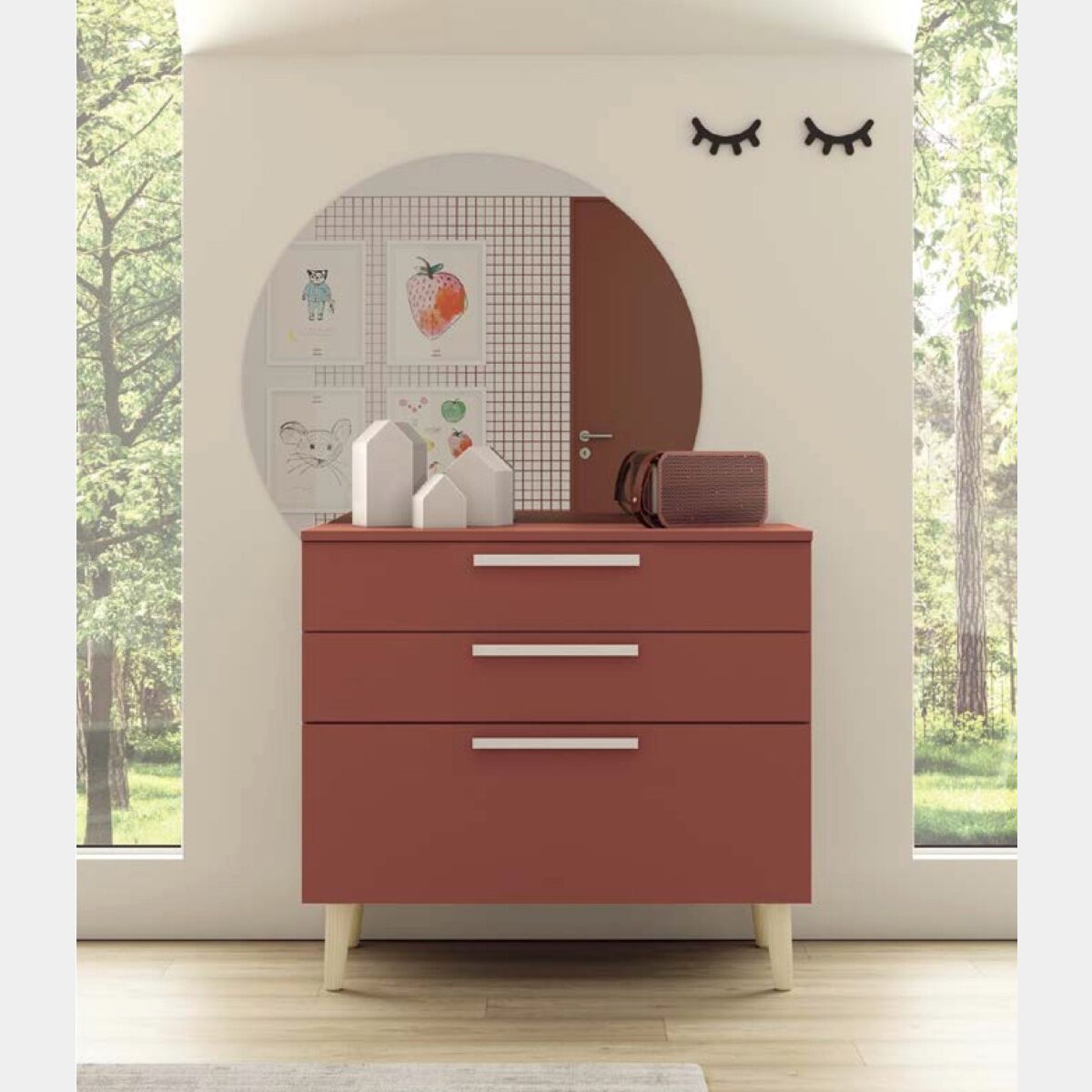 La finitura proposta per il comò è una calda tonalità di rosso: il Corallo. Colore di grande tendenza che rende la cameretta allegra e accogliente. Grazie ad un'ampia gamma di finiture è possibile personalizzare il comò per adattarlo al meglio ai propri gusti e stile!