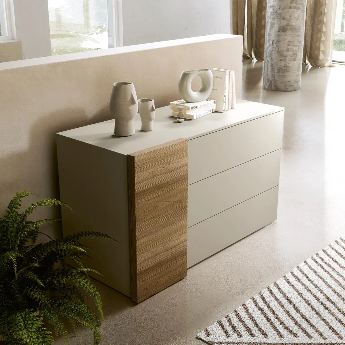 Il comò è proposto in due finiture materiche: Duna e Abete. Il netto contrasto viene appositamente creato per valorizzare al massimo le linee del mobile, mettendo in risalto l'anta.