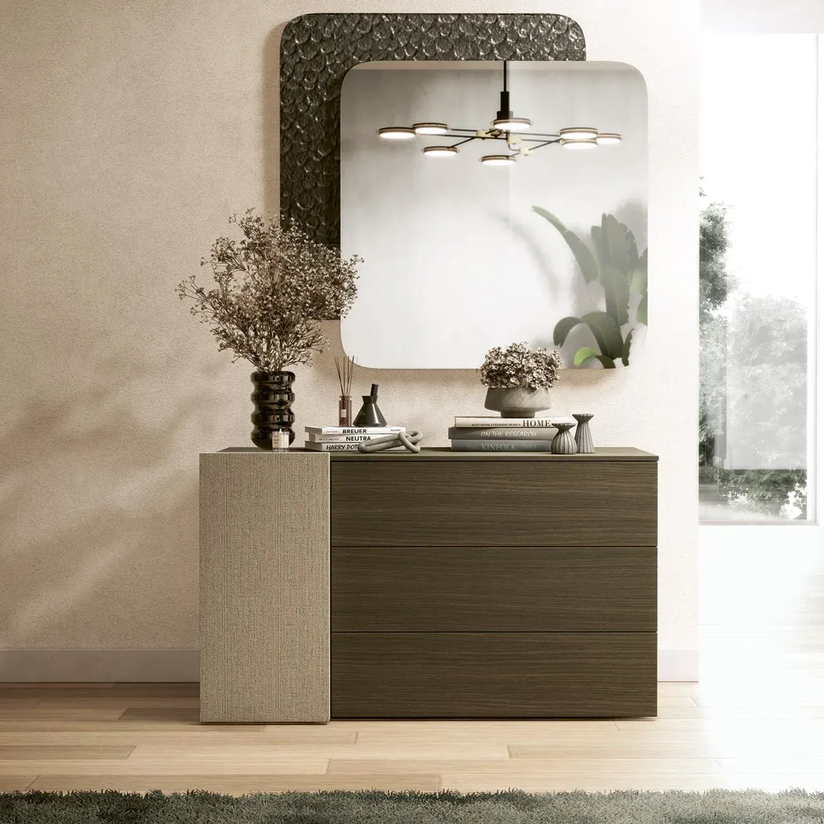 Il comò è proposto in due finiture materiche: Frassino brunito e Class. Il netto contrasto viene appositamente creato per valorizzare al massimo le linee del mobile, mettendo in risalto l'anta.