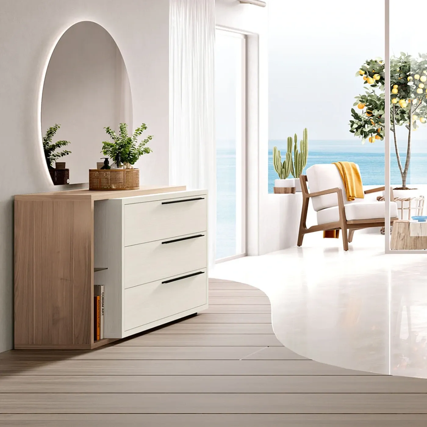 Scopri l'armonia tra design e funzionalità con questo comò, un pezzo che si distingue per la sua estetica ricercata e la sua praticità superiore. I 3 spaziosi cassetti, rifiniti con maniglie eleganti e dotati di guide quadro soft, offrono un'esperienza d'uso estremamente scorrevole e silenziosa.