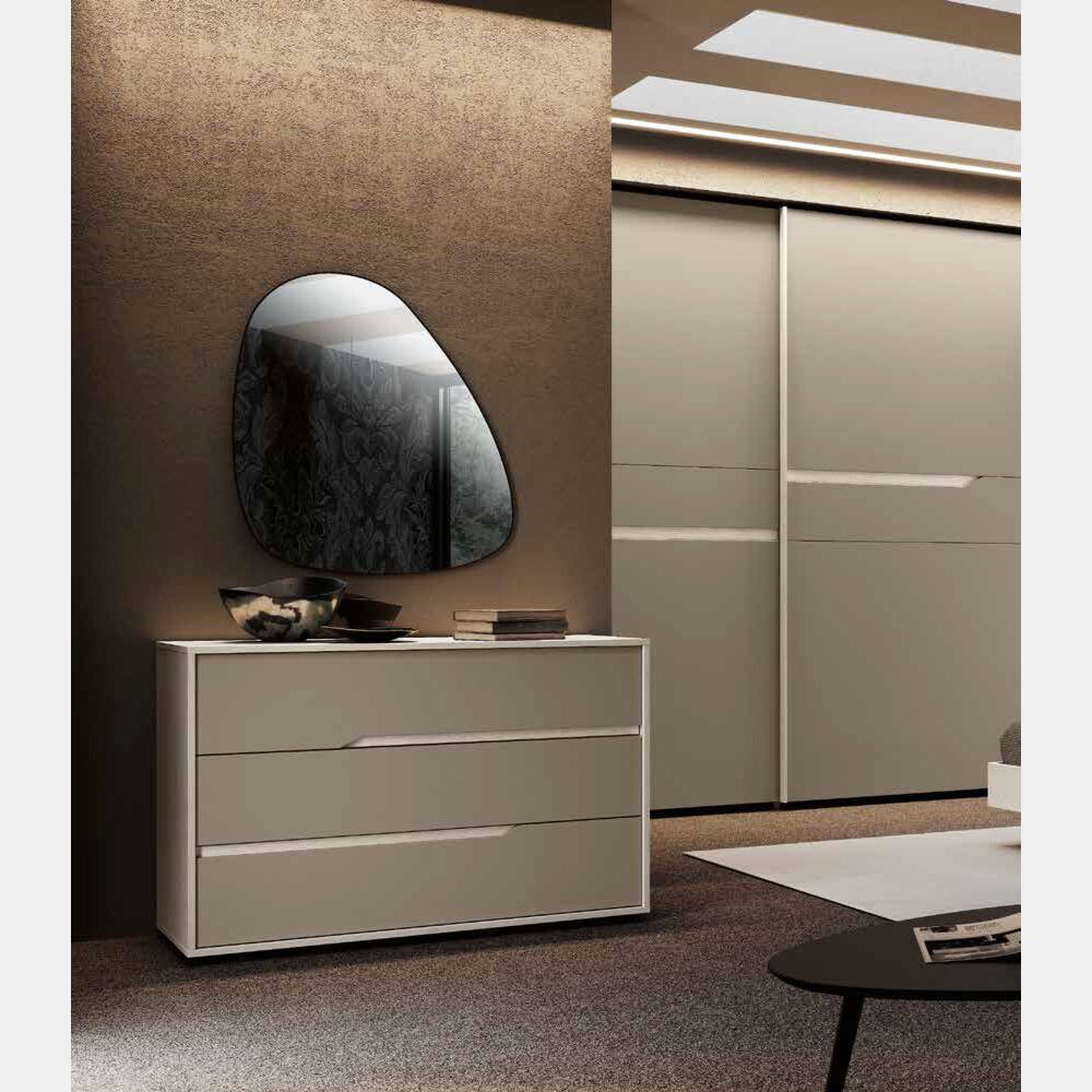 Il comò presenta due gole nei frontali in finitura bianco altea, che riprende la struttura, mentre i frontali sono in Visone. Il comò a tre cassetti può essere personalizzato nelle finture, è possibile sostituire la tinta sia di struttura che frontali, creare la giusta combinazione significa adattare perfettamente il comò alla propria zona notte, facendo emergere la propria personalità.