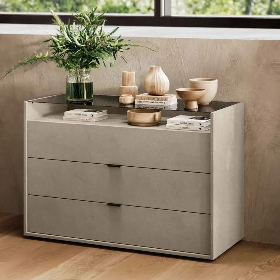 Comò con piano in vetro fumè e 3 cassetti, spatolato Argilla, retrofinito