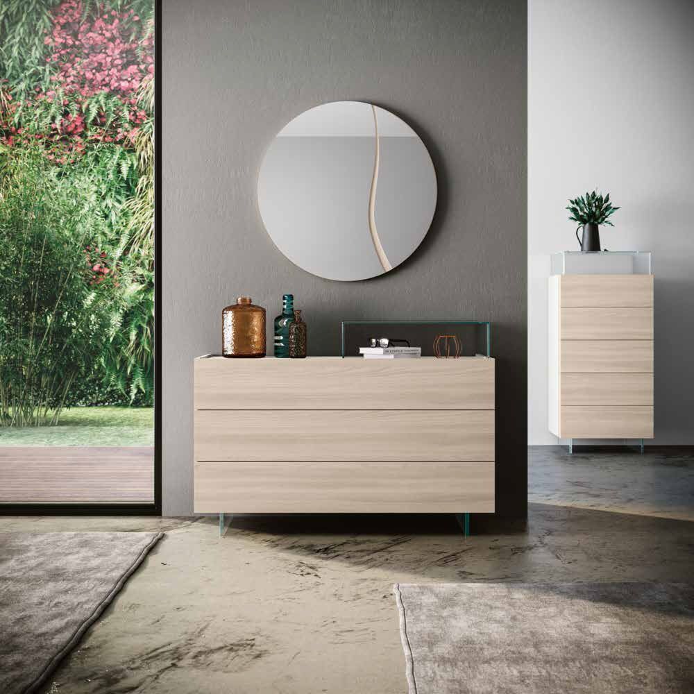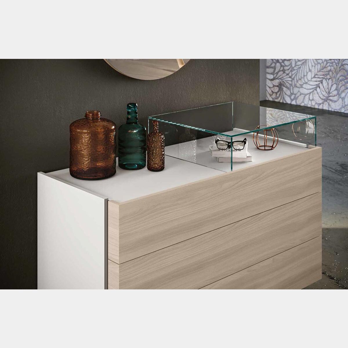 Il comò viene proposto in una calda finitura in essenza, il Olmo natura, che si contrappone ad una tonalità classica tonalità: il laccato Bianco opaco. Il contrasto delle due finiture dona personalità al comò che diventerà il protagonista della camera da letto.