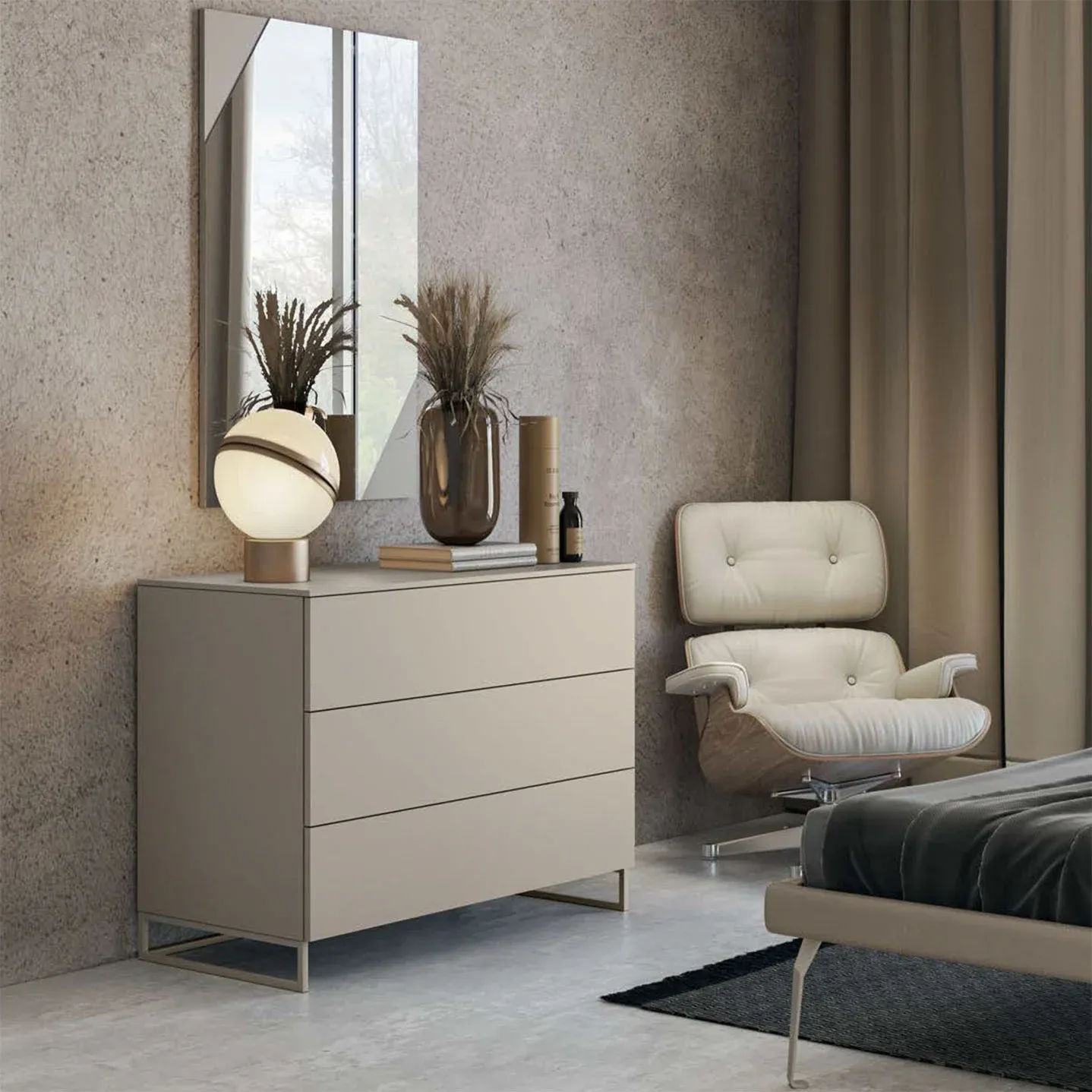 Il comò Core è caratterizzato da tre cassetti che offrono un'ampia capienza per oggetti di medie e piccole dimensioni e da un supporto in profilato di alluminio estruso in tinta, che ne completa l'estetica.