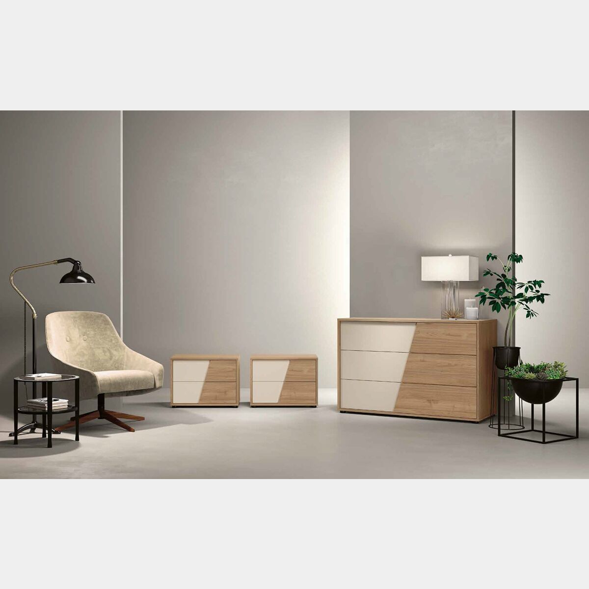 Un set moderno ed accattivante, che dona alla camera da letto carattere ed uno stile inconfondibile, in armonia con un arredo nuovo e di tendenza. Il set di comò e comodini presenta maniglie fontali che creano un effetto diagonale, caratteristica che lo rende unico e di grande impatto. Le finiture proposte sono Noce biondo per struttura e maniglie e Orzo per cassetti. L'accostamento di queste finiture renderà la stanza elegante e raffinata; grazie ad un ampio campionario disponibile è possibile personalizzare il set per adattarlo alla propria camera da letto, creando accostamenti o contrasti unici.