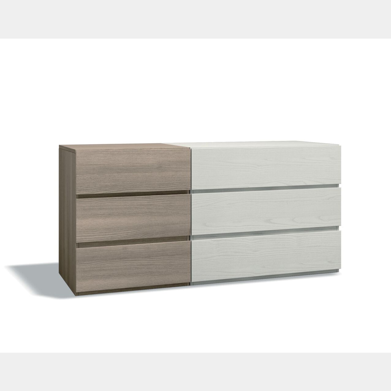 Il comò moderno presenta un design moderno e raffinato, dotato di 6 capienti cassetti fornisce un ampio spazio di appoggio, è previsto il sistema di chiusura rallentata. I cassetti minori in olmo hanno dimendisoni di L.57.6 H.24, quelli più lunghi in frassinato bianco L.86.4 H.24.