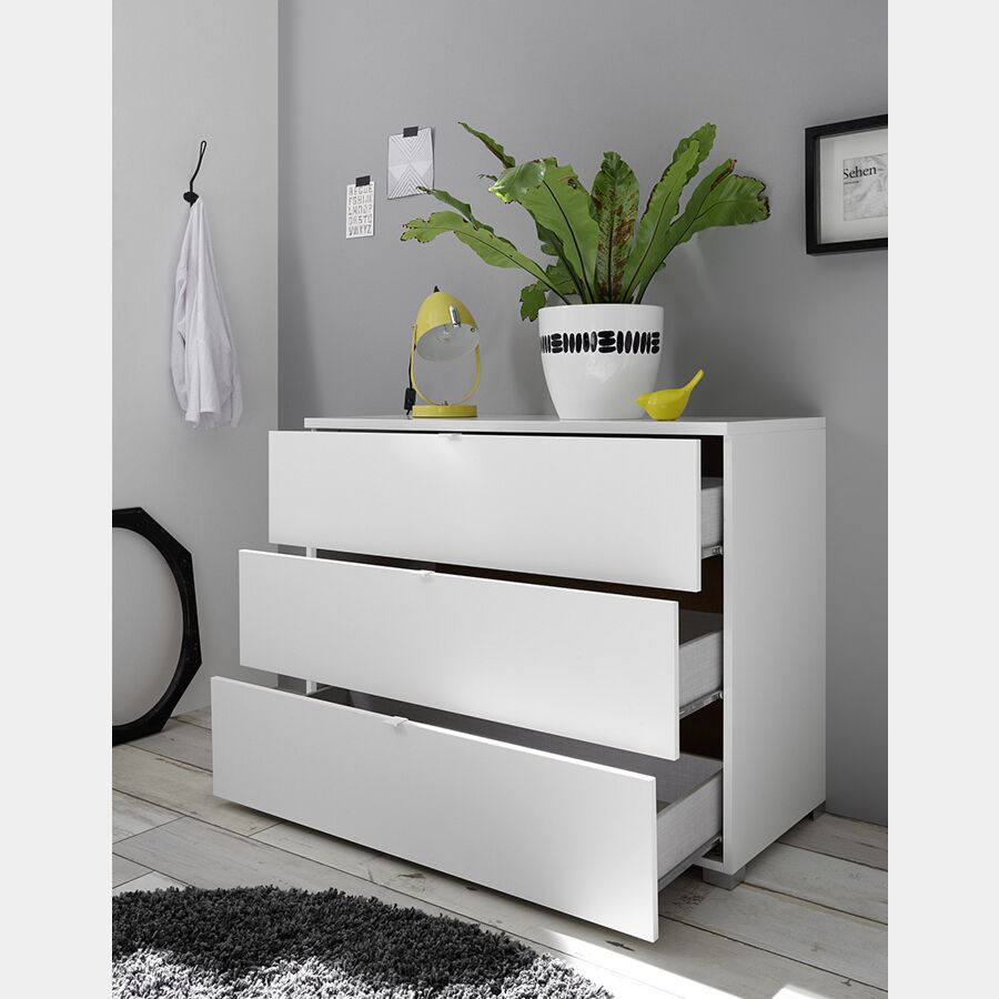 Comò 3 cassetti completamente bianco opacoUna particolarità di questa linea solo le maniglie posizionate al centro di cassetti e di dimensioni contenute, rendendo il comò più unico.