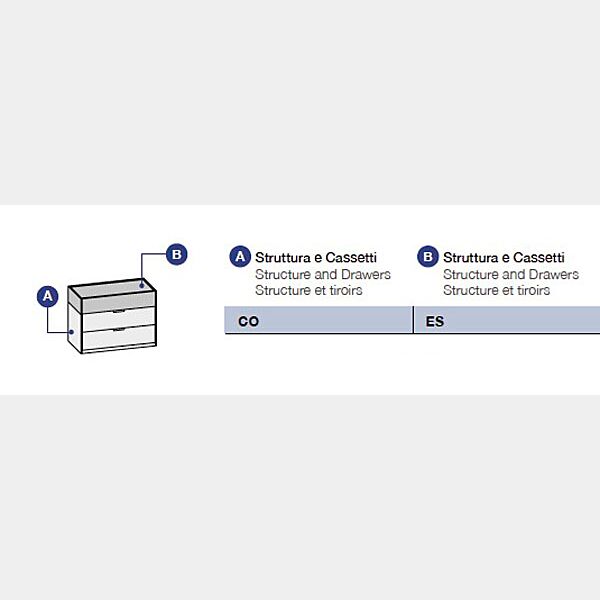 Il comò come in foto è formato da due finiture diverse quali Noce Biondo e Grigio Cenere. La parte inferiore è composta da due cassettoni con maniglia dedicata in metallo cromato, e scocca e cassettoni sono in Grigio Cenere. La parte superiore invece ha solamente un cassettone con maniglia a presa superiore e scocca e cassettone sono in Essenza Noce Biondo.