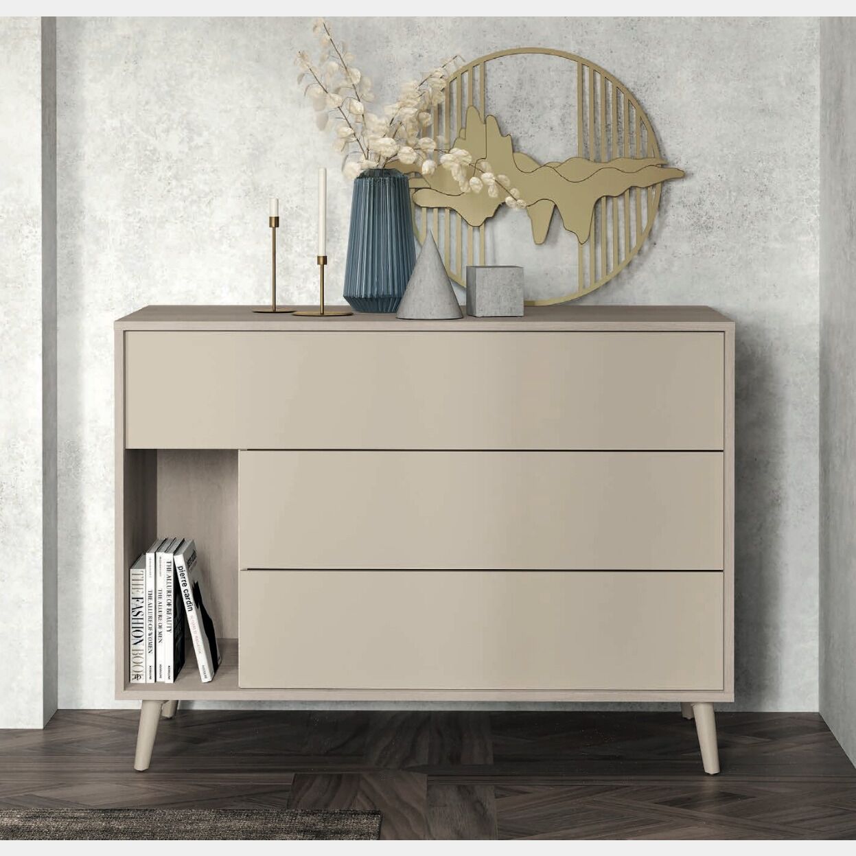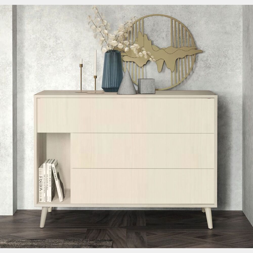 Comò moderno 3 cassetti e vano in finitura Ciliegio bianco e Canapa
