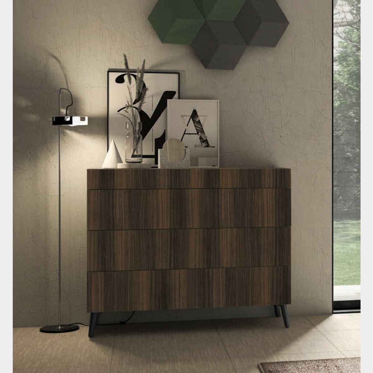 Il comò è caratterizzato da 4 cassetti, 3 con altezza 24 cm ed uno con altezza 12. Tutti i cassetti sono dotati di chiusura rallentata di serie, l'apertura è a presa laterale. Un dettaglio che valorizza il comò sono i particolari piedini che ricordano vagamente lo stile nordico. Anch'essi sono personalizzabili nelle finiture indicate nel menù a tendina.