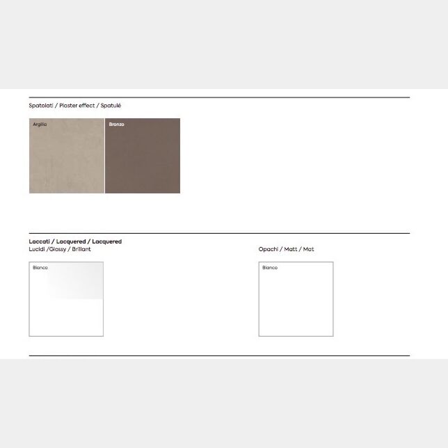 Possibilità di scegliere tra i colori disponibili dei frontali e scocca: Orzo, Visone, Grigio cenere, Grigio seta, Agave, Petrolio, bianco opaco, blu avio e giallo grano