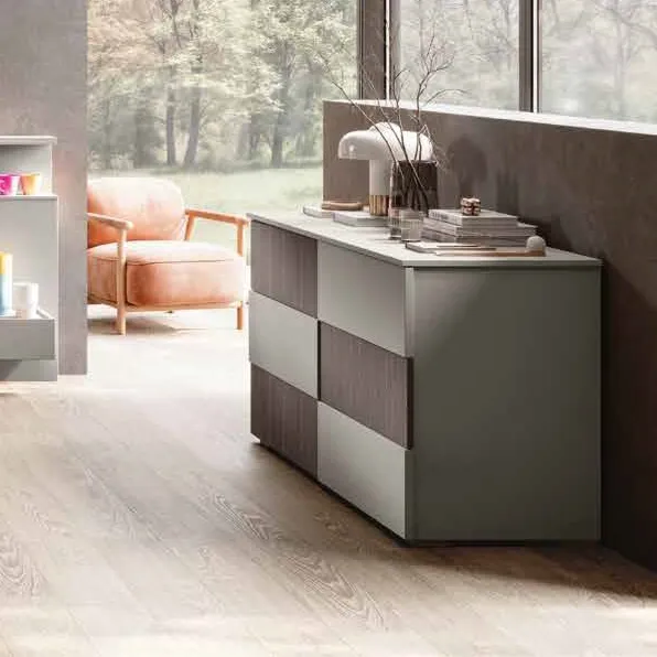 I frontali, proposti in finiture alternate, creano un piacevole gioco cromatico che caratterizza il comò e lo rende accattivante; l'ampia gamma di finiture disponibili consente una completa personalizzazione del mobile, per adattarlo al meglio al proprio stile.