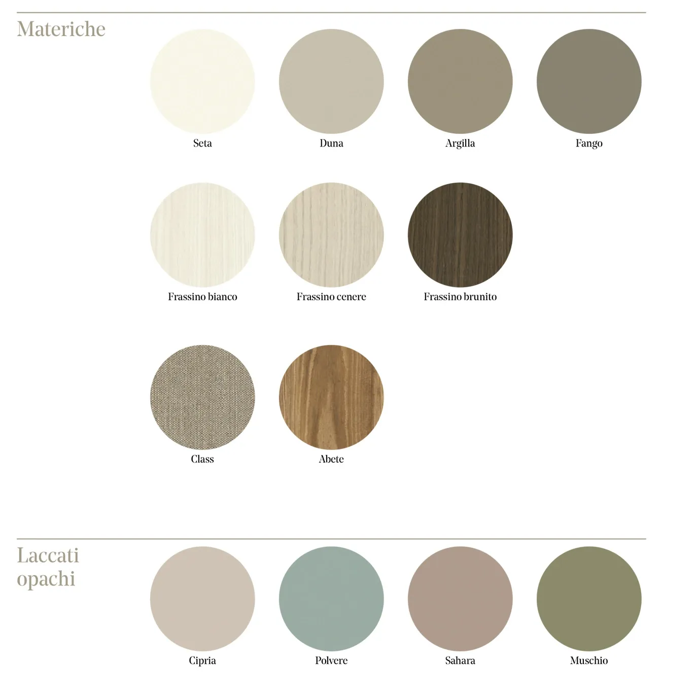 La finitura proposta, il materico Fango, può essere sostituita da altre tinte, sempre nobilitate o laccate, a seconda del proprio gusto. Il dettaglio specchio è invece disponibile in bronzo o fumè.