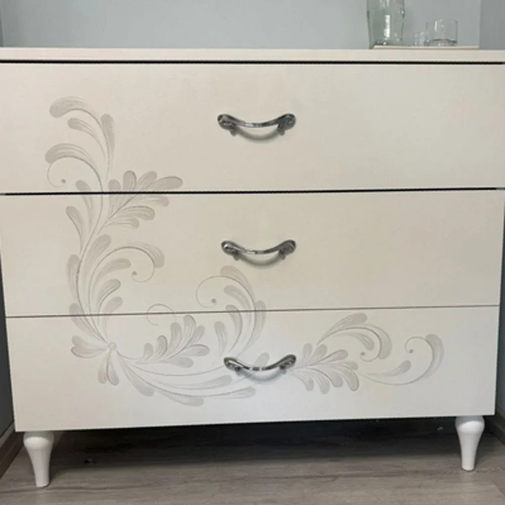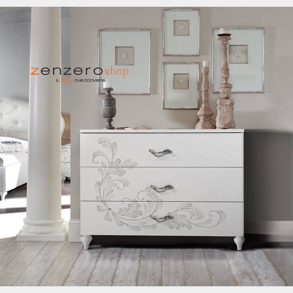 Il comò presenta uno stil econtemporaneo, la serigrafia florale abbellita da brillanti e i particolari piedini rendono il comò moderno ed elegante, perfettamente adattabile ad una camera da letto moderna, ma anche tradizionale. Le particolari maniglie non passano inosservate: il loro design arrotondato assicurano un arredamento unico e ricercato.