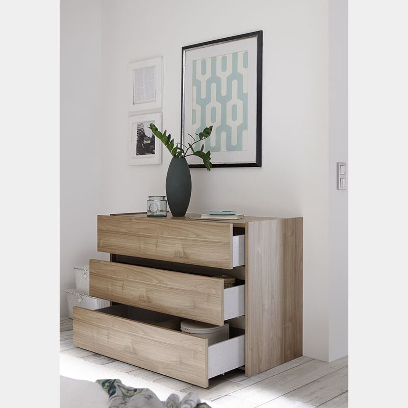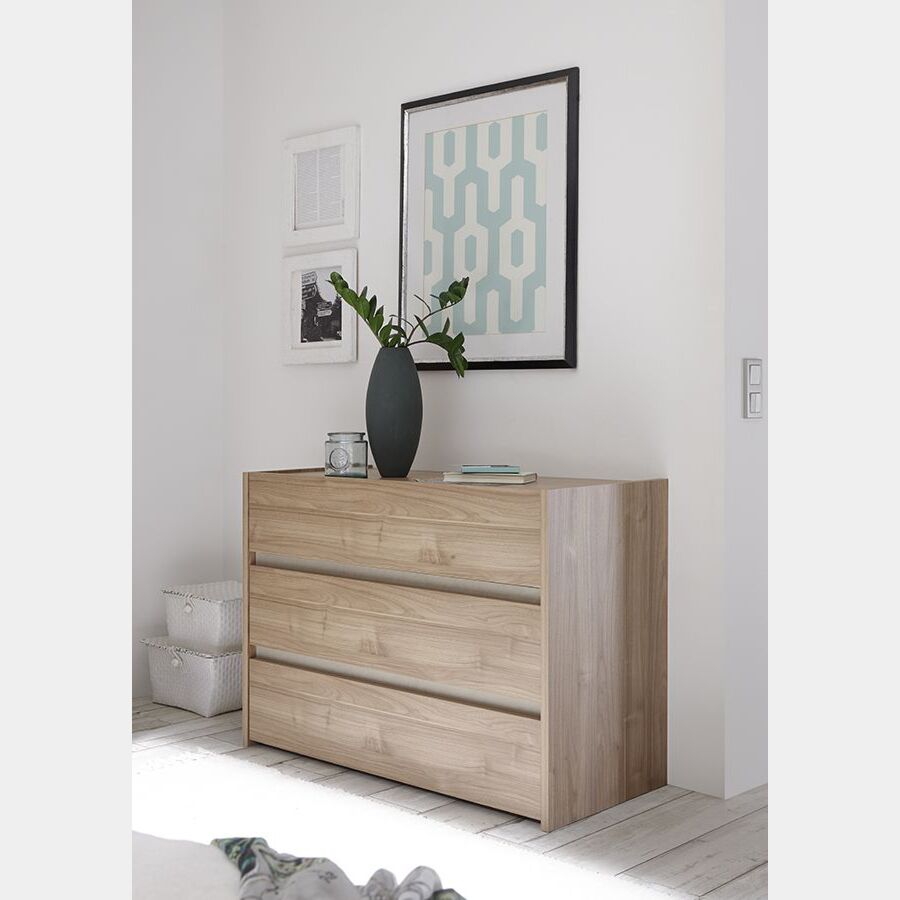 Comò per zona notte con 3 cassetti e maniglie a gola. Il comò della Collezione Mondo si presenta nella finitura noce chiaro con inserti argilla. I 3 cassetti si aprono con maniglie moderne a gola. La struttura e cassetti hanno uno spessore di 22mm.