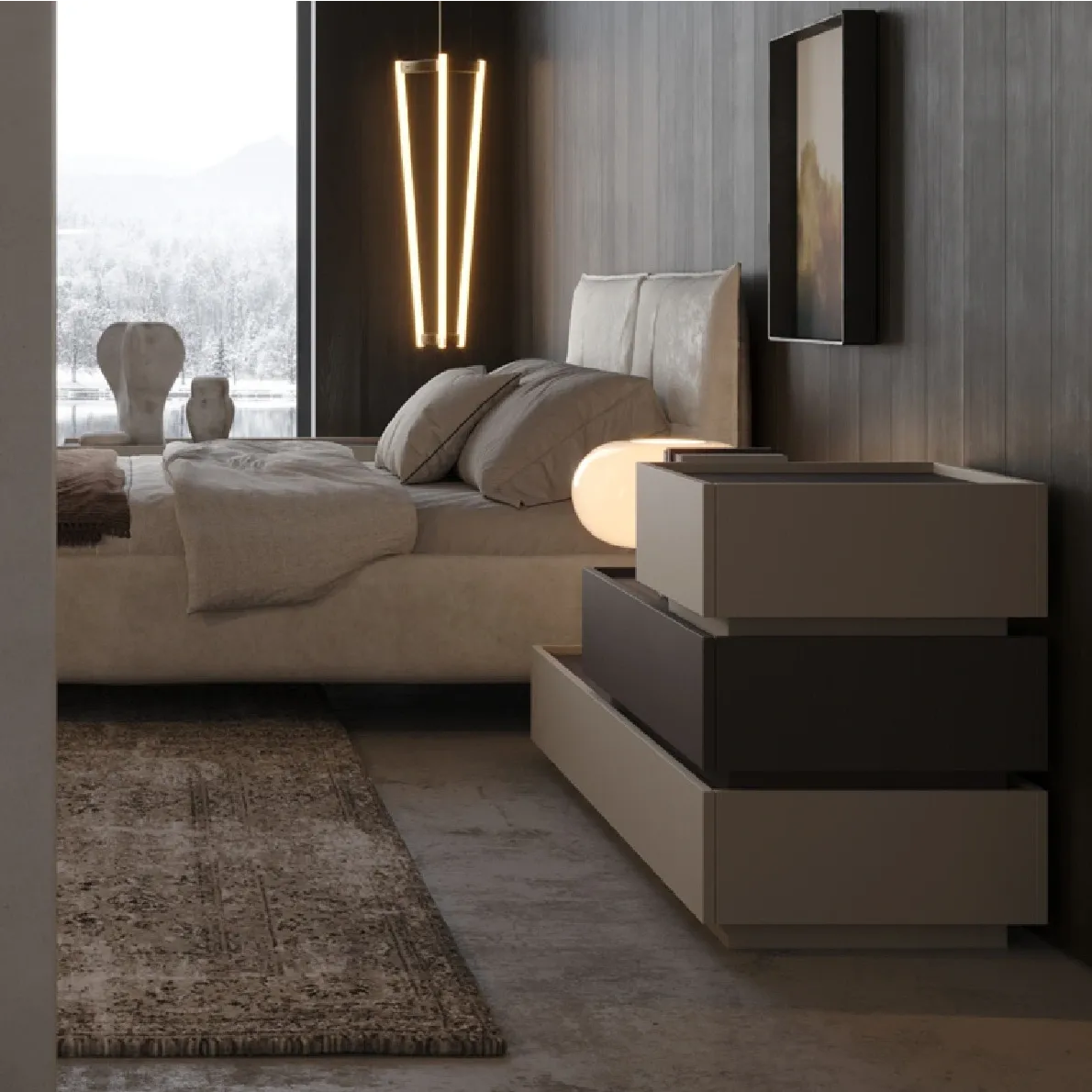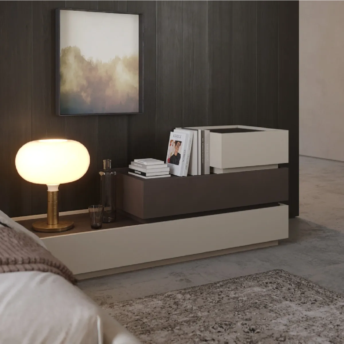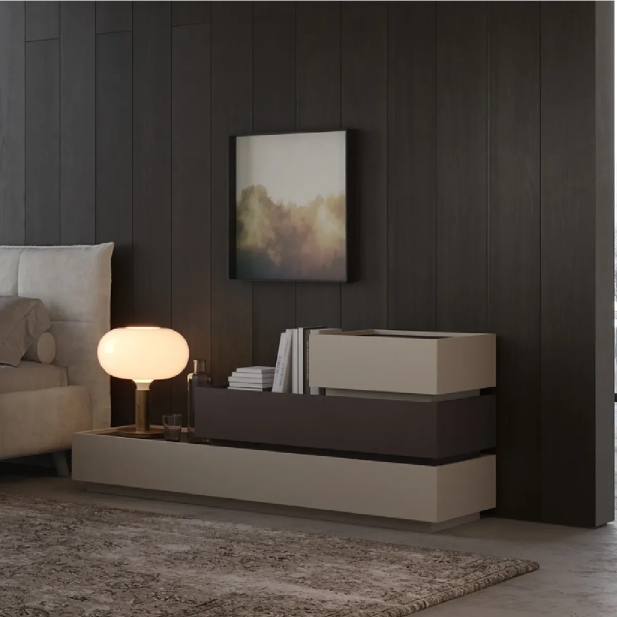 Comò caratterizzato da tre elementi di lunghezze differenti che creano un design " a scala", perfetto per ogni camera da letto. Scopri tutta la collezione Orizzonte!